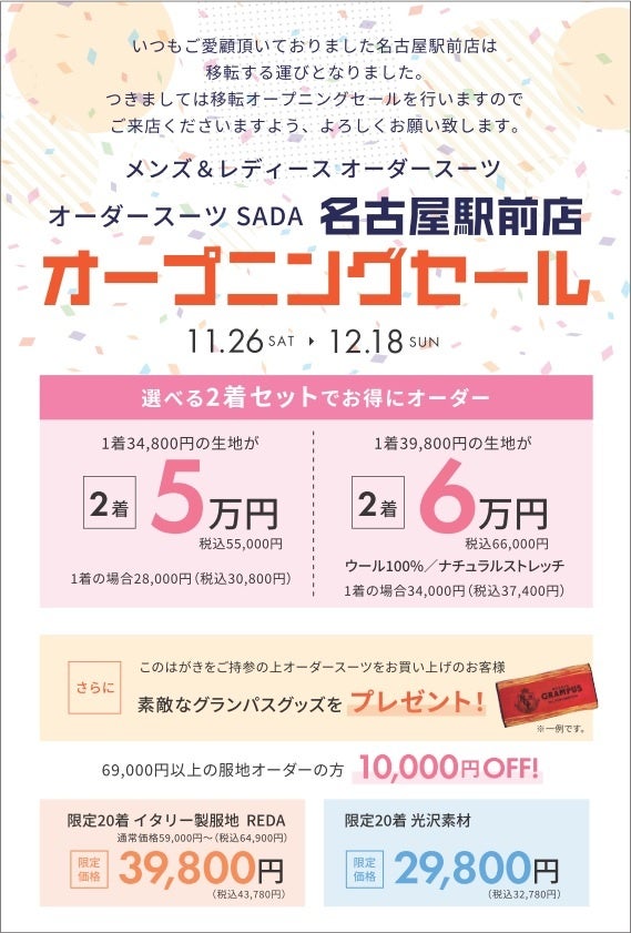 オーダースーツSADA「名古屋駅前店」移転オープニングセールのお知らせ