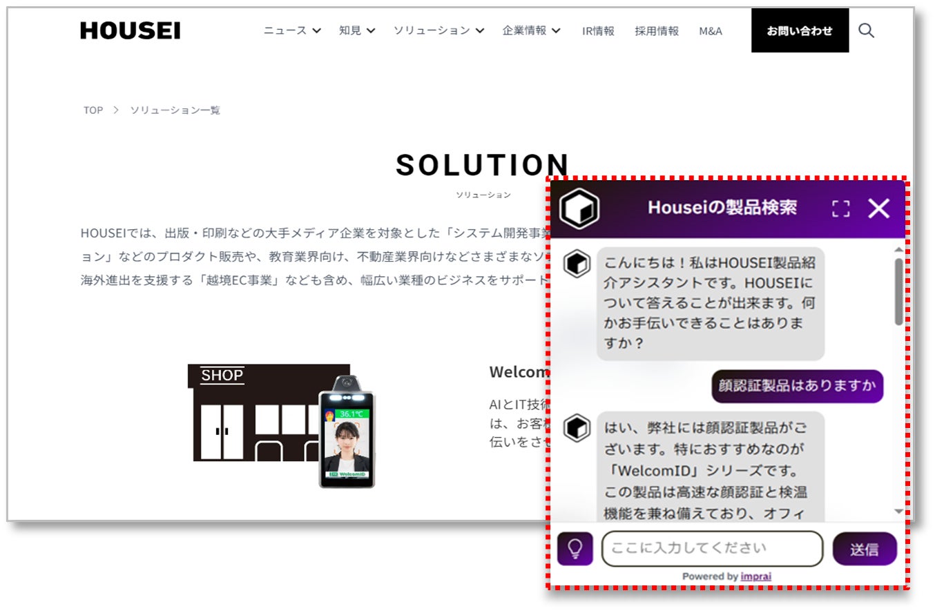 AI・DXソリューションを提供するテクノロジーカンパニー、HOUSEI株式会社(本社:東京都新宿区、代表取締役社長 管祥紅 以下:HOUSEI)は、企業の顧客対応業務を効率化し、ユーザの検索体験を向上させる生成AIチャットボットサービス「imprai ezKotae」(インプライ イージーコタエ) の提供を開始することをお知らせいたします。