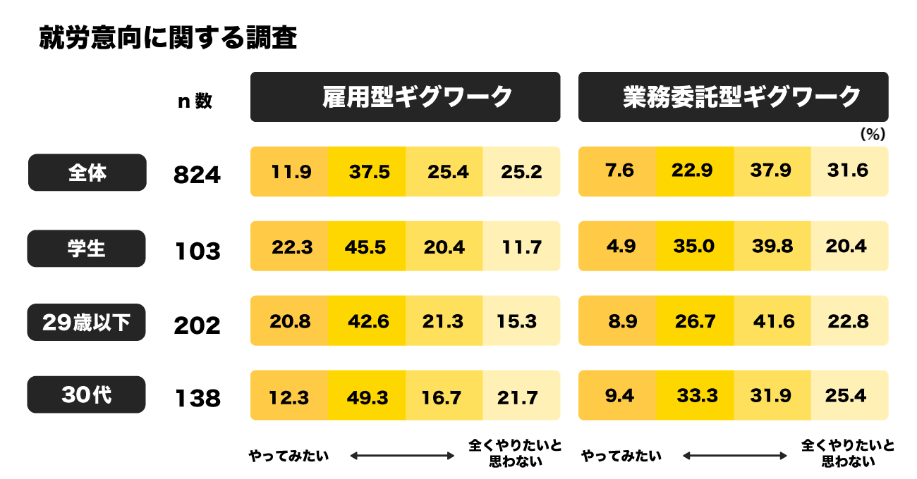 「雇用型ギグワーク」への就労意向は49%と、「業務委託型ギグワーク」の就労意向31%よりも高い結果になり、特に学生・20代以下・30代の若い層では好意的にうけとめられていました。(学生=68%、20代以下=63%、30代=61%)
