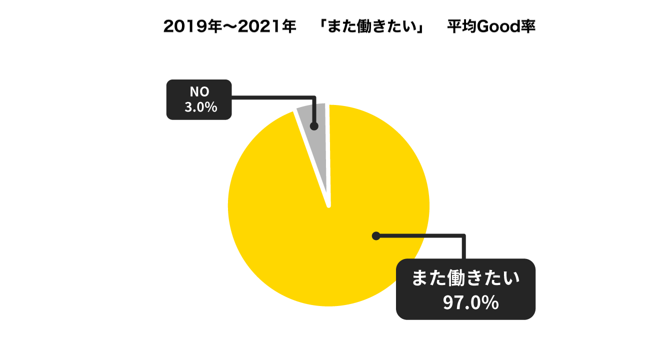 タイミーで働いていただいた方対象のアンケートでは「またこの職場で働きたい」と回答した方が全体の約97%となりました。タイミーでのスキマバイト(スポットワーク)に高い満足度を感じながら、安心して就業できている様子がうかがえます。