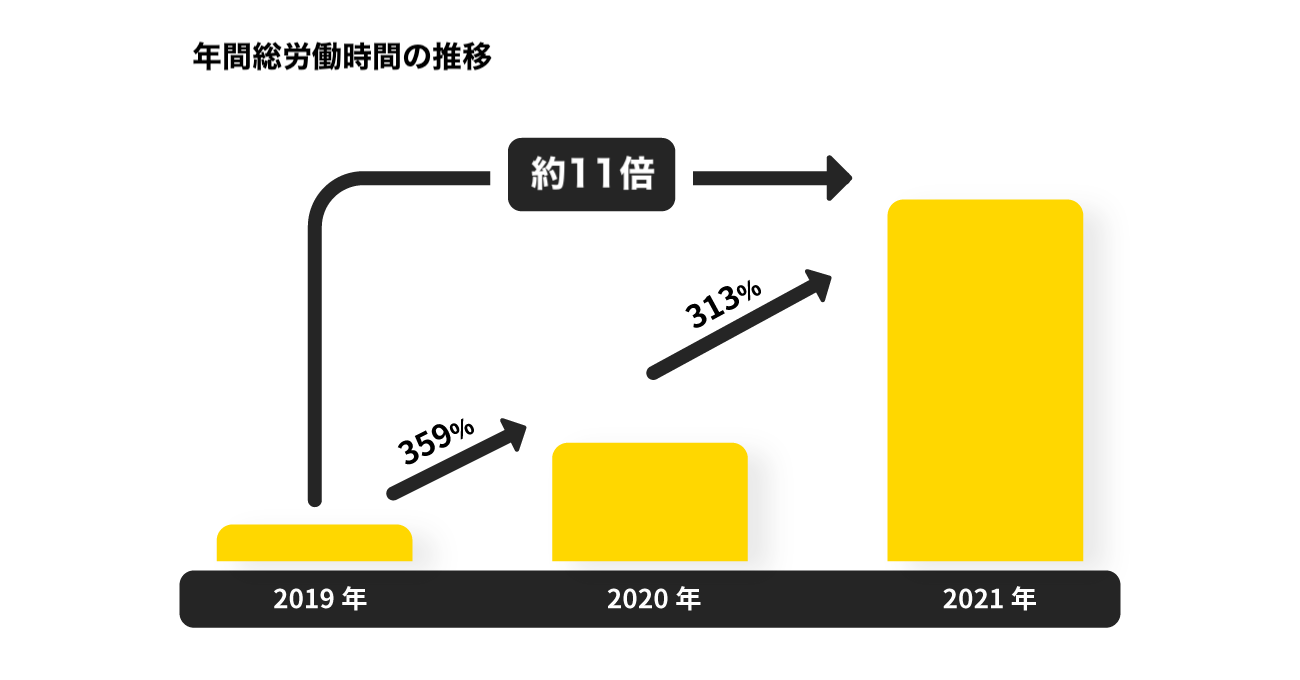 事業者側だけではなく、働き手側のニーズも順調に拡大しています。2021年の1年間でユーザー数は約60万人増加し、現在は約230万人の方にタイミーをご利用いただいています。また、2021年のタイミー上の働き手の労働時間の年間総計が2019年から約11倍に拡大していることからも、スキマバイト(スポットワーク)シーンが大きく拡大して社会に順調に受け入れられていることがうかがえます。