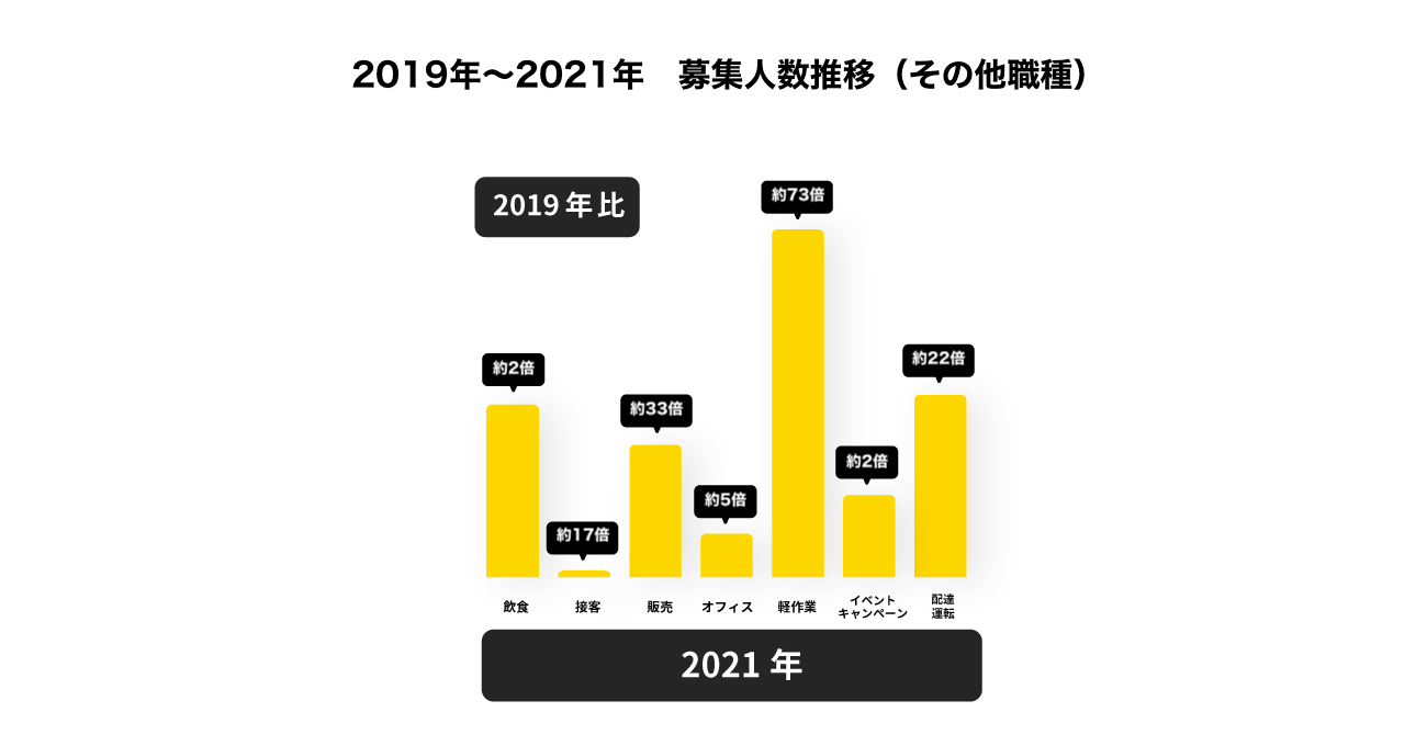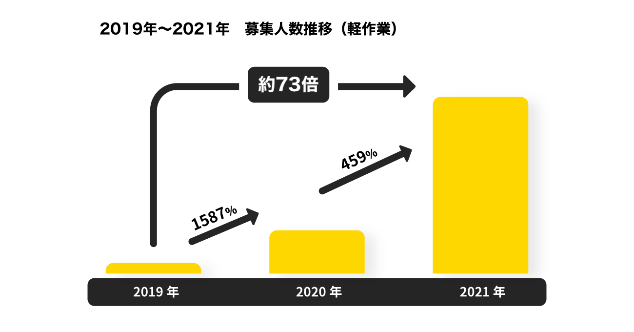 中でも最も拡大の幅が大きかったのは軽作業(物流など)で、2019年比で約73倍になりました。