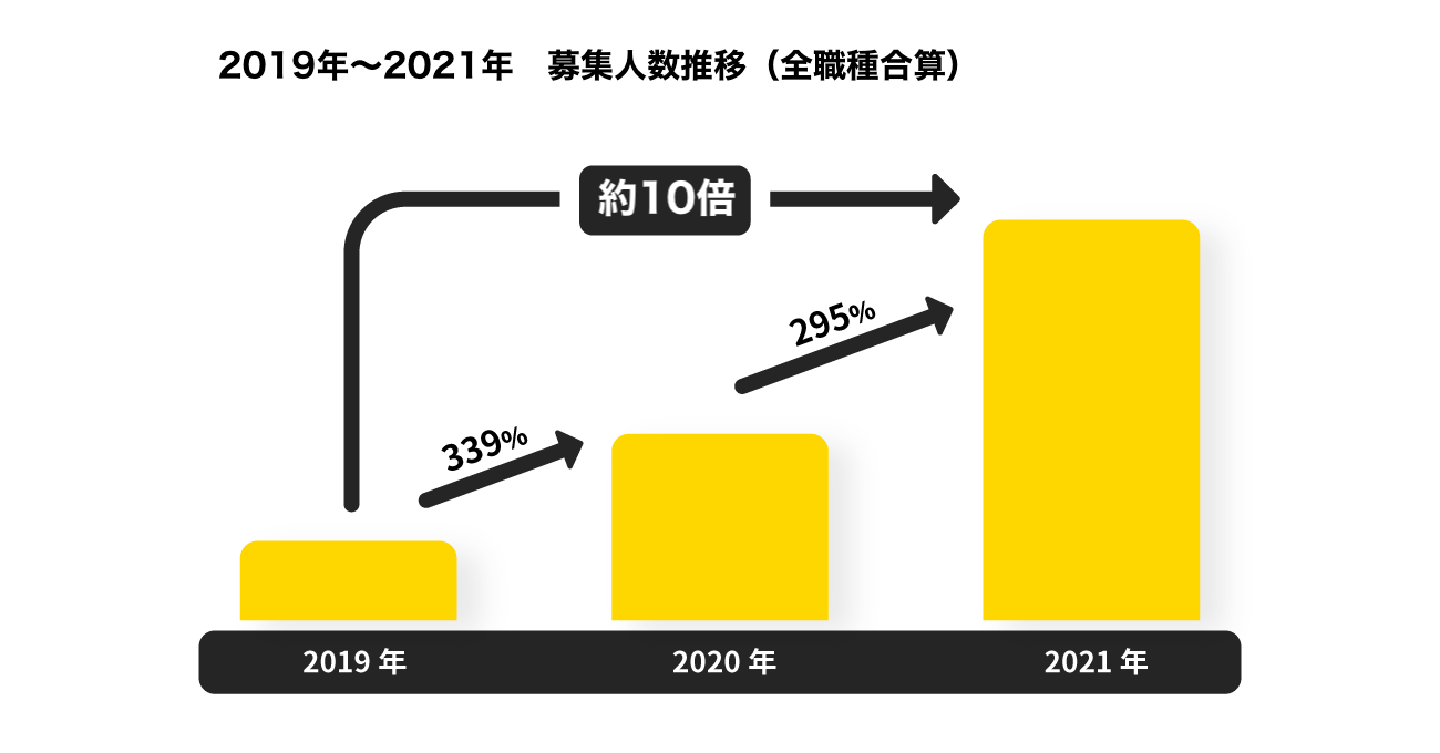 2021年のスキマバイト募集人数(※タイミーアプリ上の募集人数)は、2019年から約10倍に。タイミーでの求人数が大きく拡大しました。