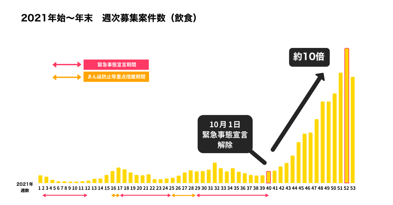 年末シーズンなどの繁忙期には、飲食店での募集人数の需要が急激に高まり、2021年10月1日の緊急事態宣言解除タイミングと比較して、約10倍の募集が掲載されました。スキマバイトの働き手が人手不足に困る飲食店を支えてくれたと言えます。