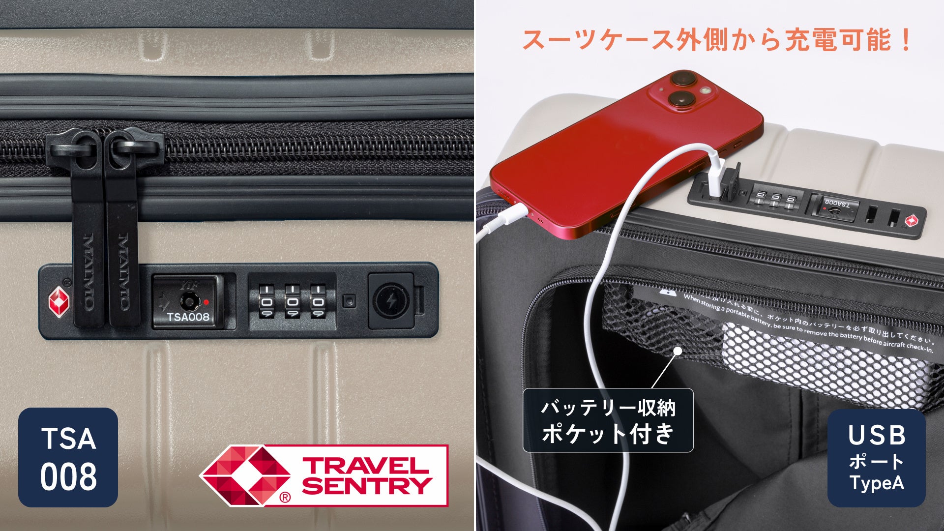 鍵の必要のないダイヤル暗証番号タイプで、検査官による再施錠漏れを防ぐ機能もありダブルで安心です。またUSBポートも搭載しており、ご自身のモバイルバッテリーを収納して、スーツケース外側から電源を取ることができます。手持ちカバンにバッテリーを入れる必要がないので、これまでよりも身軽にご旅行いただけます。