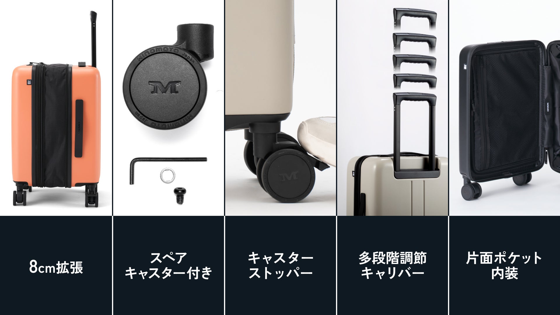 ファスナーを開くだけで、約30%容量を増やすことが出来ます。行きはコンパクトで機内持ち込み可能。帰りは大量のお土産を買っても安心です。また、キャスターは静音性に優れ、深夜や早朝の移動でも走行音は気になりません。取り外しも簡単で、別売りのスペアキャスターに交換することで長くお使いいただけます。
