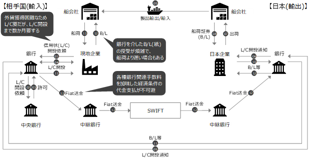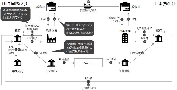 一方で、対新興国貿易の場合、1,000兆円を超える取引規模がありながら、情勢や経済制裁による外貨規制や、信用状取引の利用制限といった問題で、スムーズな米ドル決済を行うことができず、送金に数カ月もの時間がかかったり、多国・多数の銀行を経由するため手数料が嵩んだりと、不平等や不利益を抱えたまま、現在も世界中で取引が行われているのが現実です。