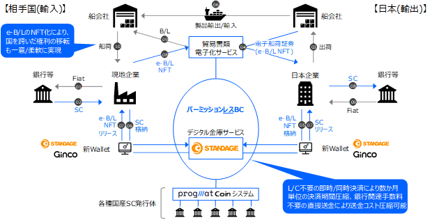 新興国向けに実貿易を行っている日系企業の協力のもと、STANDAGEの貿易決済システムとパーミッションレスブロックチェーン上の“仮想国産SC”を用いた送受金の実証を行います。