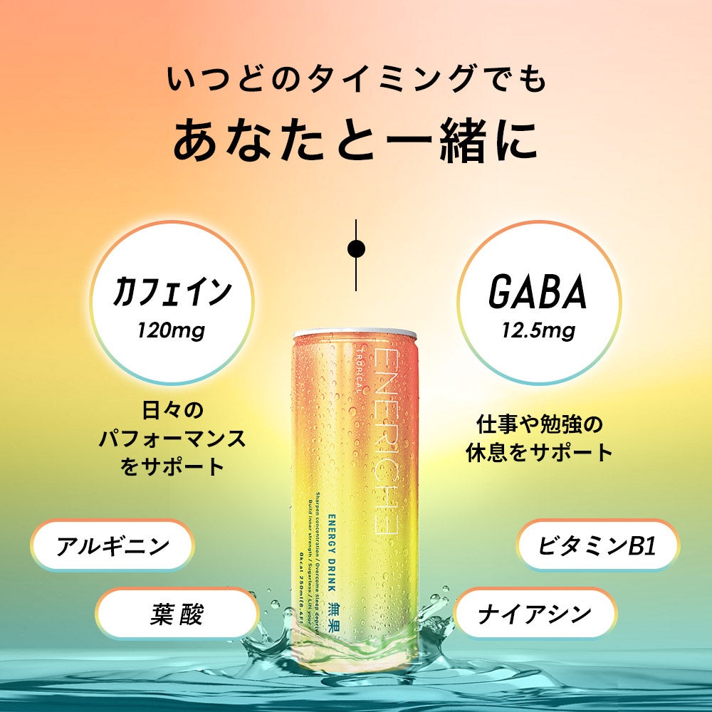 ENERICHEエナジードリンクは全フレーバー、カフェイン120mgとGABA12.5mgを配合。