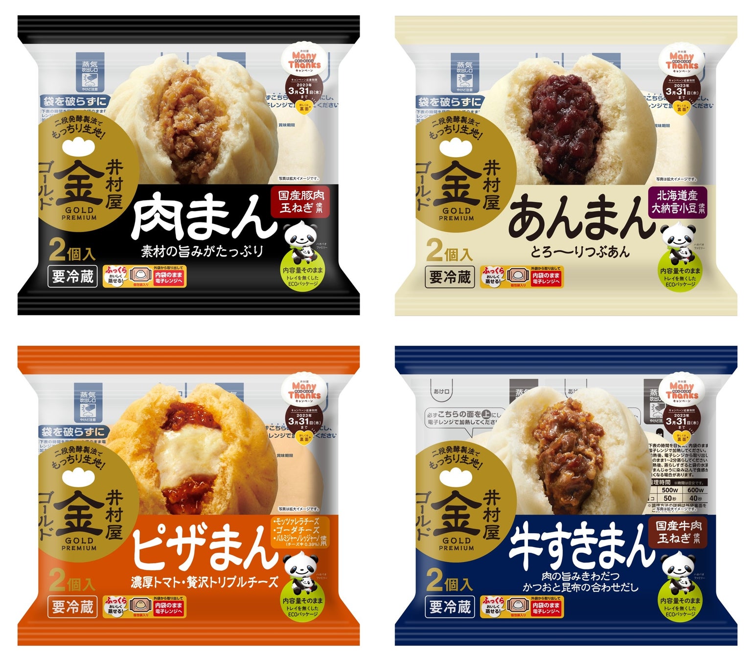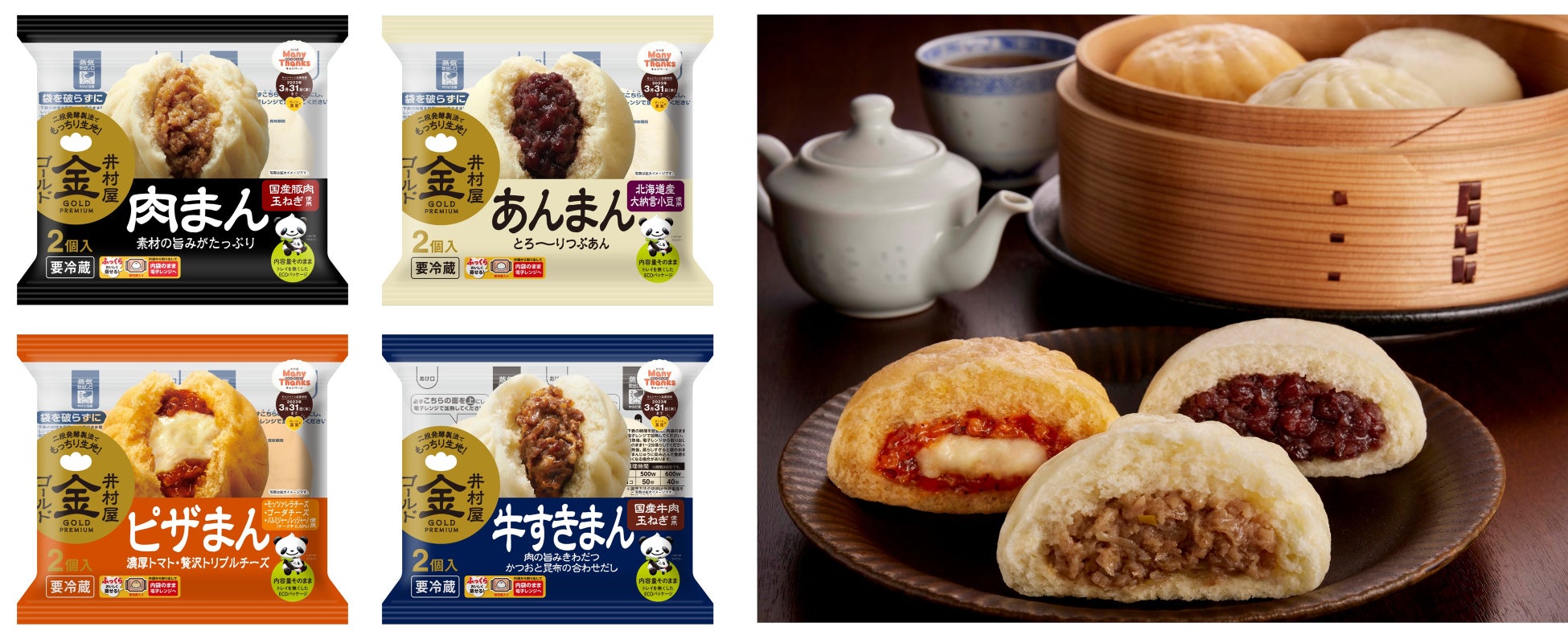 | 商品名・内容量 | 2コ入ゴールド肉まん 236g(118g×2コ) 2コ入ゴールドあんまん 236g(118g×2コ) 2コ入ゴールドピザまん 216g(108g×2コ) 2コ入ゴールド牛すきまん 176g(88g×2コ) |