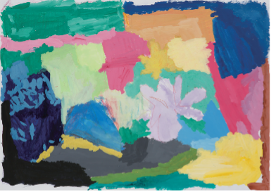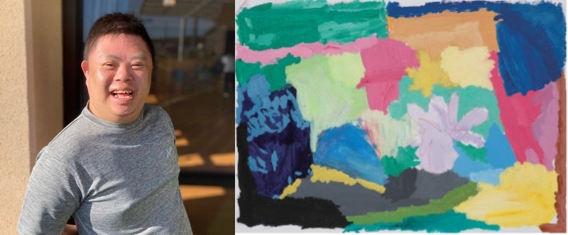 日々とうふ工房にておとうふの製造販売に励む彼は、販売に出れば、持ち前の人当たりの良さでお客さんの中に彼のファンができるほど。本人は常に自然体。たどたどしい言葉ながら熱心に販売に取り組む姿勢が周りを惹きつける。彼がおのずと筆を走らせた作品が今回の作品。被写体を見ながら描くのではなく、彼の中にある花はチューリップやヒマワリ、サボテンなど様々で枠にとらわれず咲かせたかったとのこと。たくさんの色を重ねたのもお気に入り。「レモンイエローがいいねん」は描き上げた彼の言葉