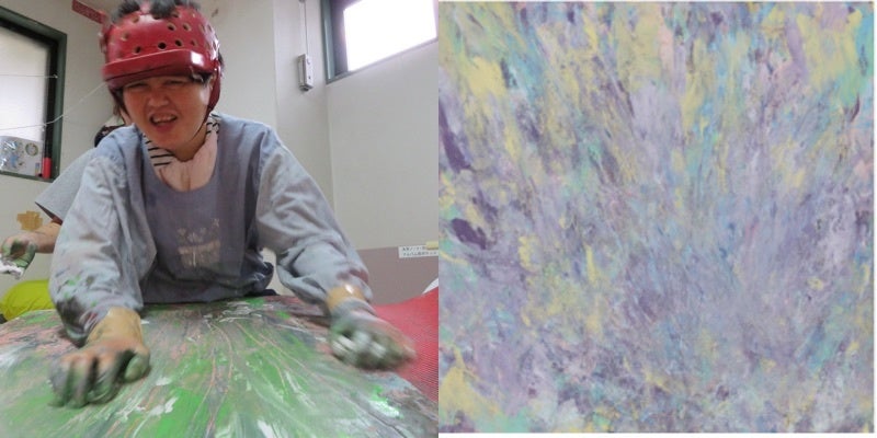 車椅子から降りて、広々とした空間で自由にめいっぱい描きます。手のひらに乗せた絵の具を、全身を使ってキャンバスの上から下まで、いっぱいいっぱい使って表現します。出来上がった絵は、力強くダイナミックでもあり、深みのある仕上がりになります。完成した絵を誇らしげに発表する時はとても素敵な表情です。
