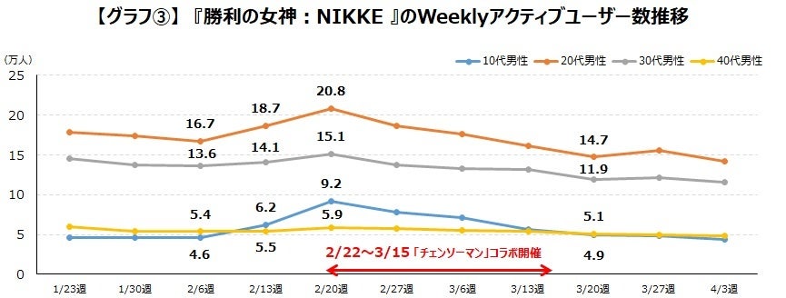 前項で解説したように、コラボの告知が行われた2月13日週からユーザー数が増加を始めましたが、年齢層別に見ると、コラボ開始週には20代男性は20.8万人、10代男性は9.2万人まで増加しています。特に10代男性はイベント発表前である2月6日週と比較すると2倍に増加しています。その反面、ユーザー数の増加が鈍かったのは、30代と40代の男性で、30代男性はコラボ前後を比較しても増加数は2万人未満、40代男性も増加数は1万人未満となっています。【グラフ③】