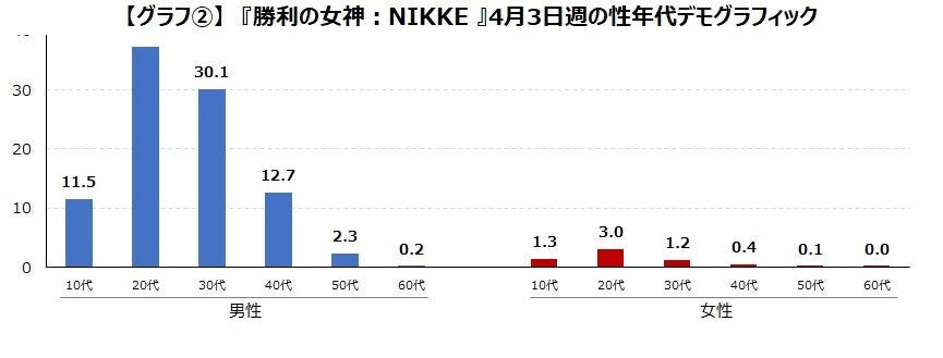 『NIKKE』のユーザーは男性が90%以上を占めていますが、その中でも、20代と30代男性だけで約70%、10代と40代の男性ユーザーはそれぞれ10%という構成になっています。【グラフ➁】