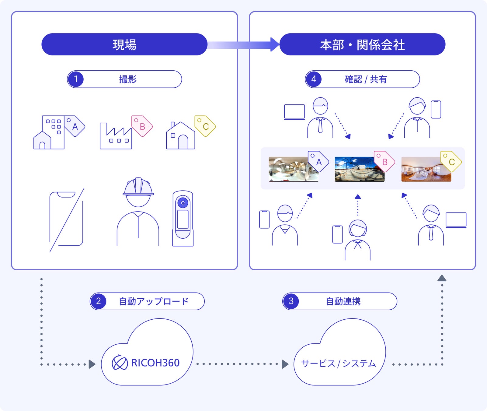 撮影後処理を不要に:RICOH360 Cloudへの自動アップロードとパートナーのシステム連携により、利用中のパートナーシステムから直接画像を確認できます。