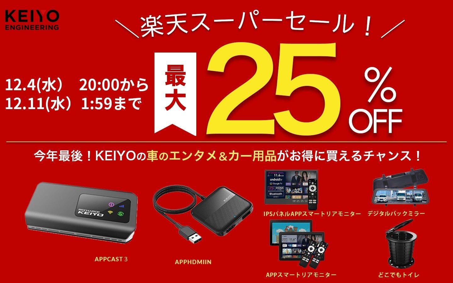 株式会社慶洋エンジニアリング(東京都港区新橋)は、楽天市場で開催される楽天スーパーSALE(12月4日(水)20:00~12月11日(水)1:59)にてKEIYO製品を最大25%OFFのセール価格で販売いたします。