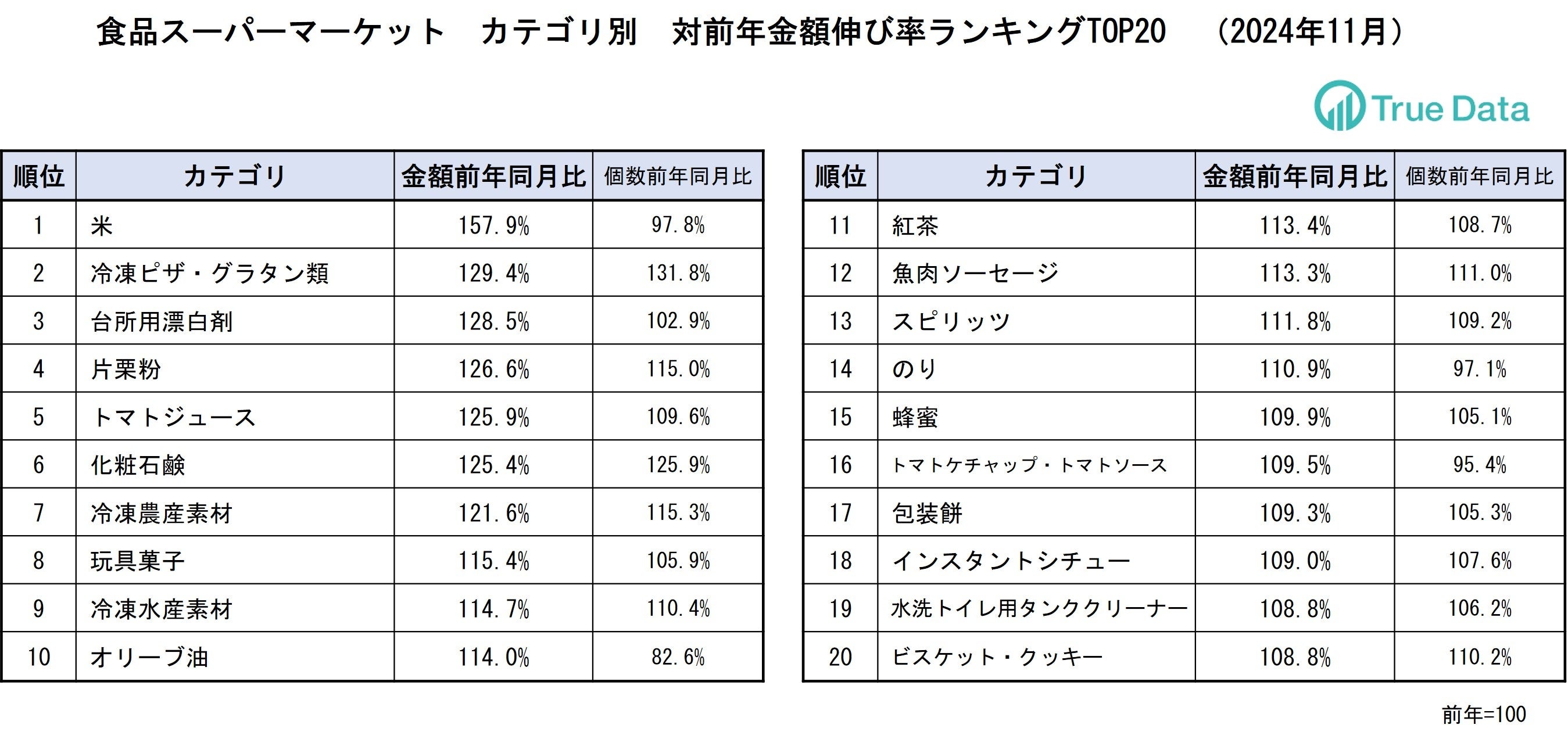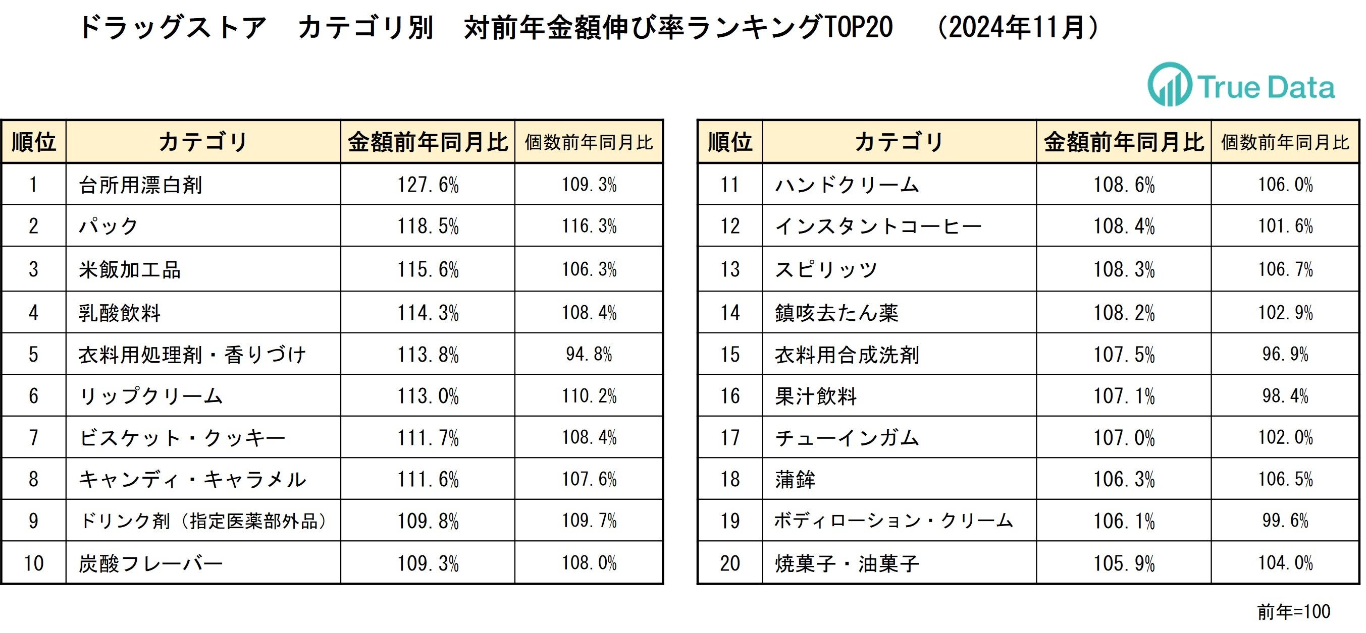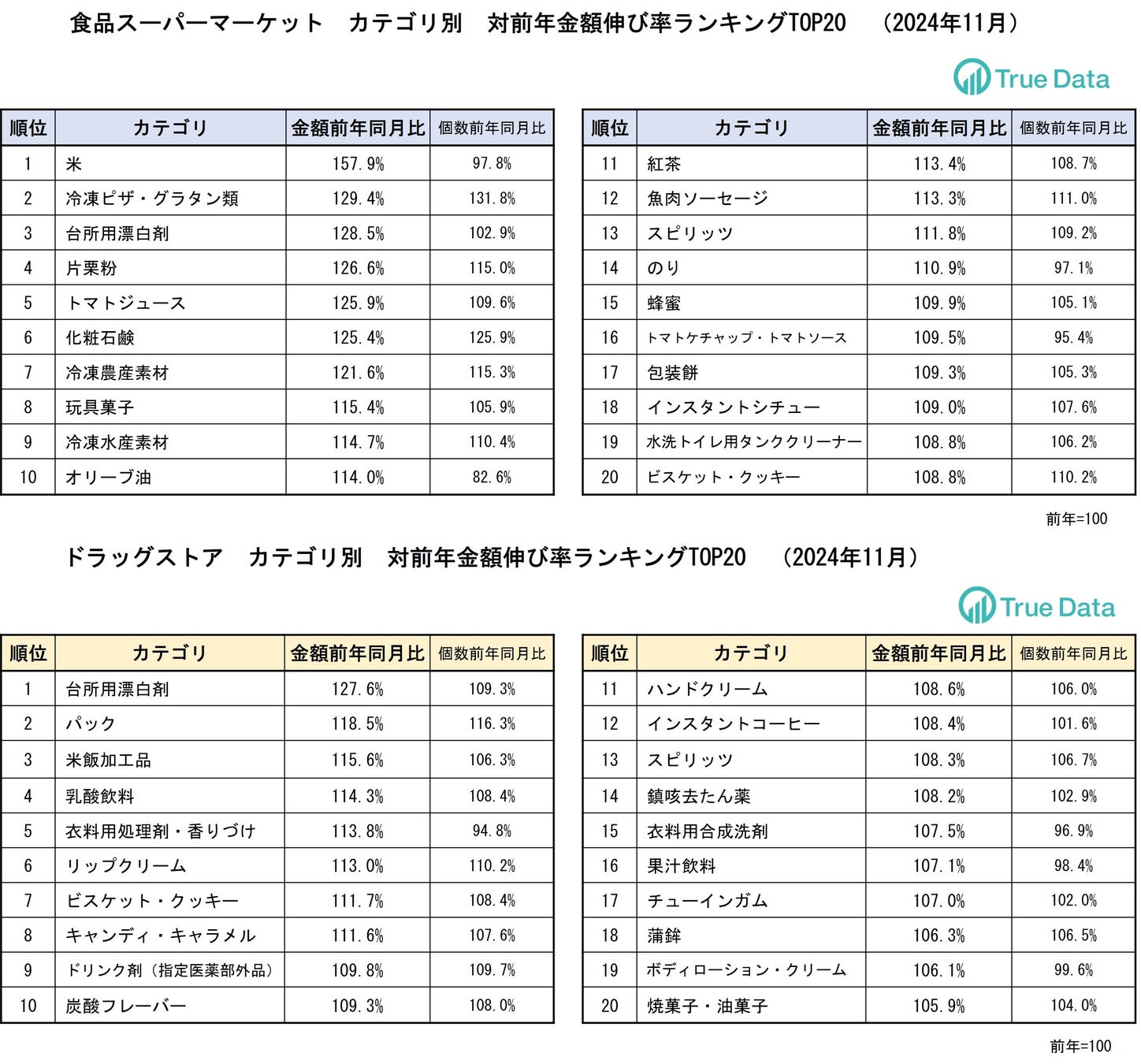 ~ドラッグストア、食品スーパーマーケット 対前年伸び率TOP20カテゴリを発表【 2024年11月 】~