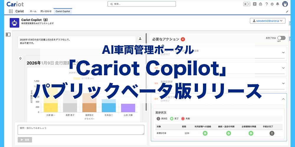 株式会社キャリオット(本社:東京都港区、代表取締役社長 齋藤 洋徳)がサービス展開するクルマと企業をつなぐドライバー働き方改革クラウド「Cariot(キャリオット、以下Cariot)」は、AI車両管理ポータル「Cariot Copilot(キャリオット コパイロット)」のβ版をアップデートし、パブリックベータ版として提供開始したことをお知らせします。