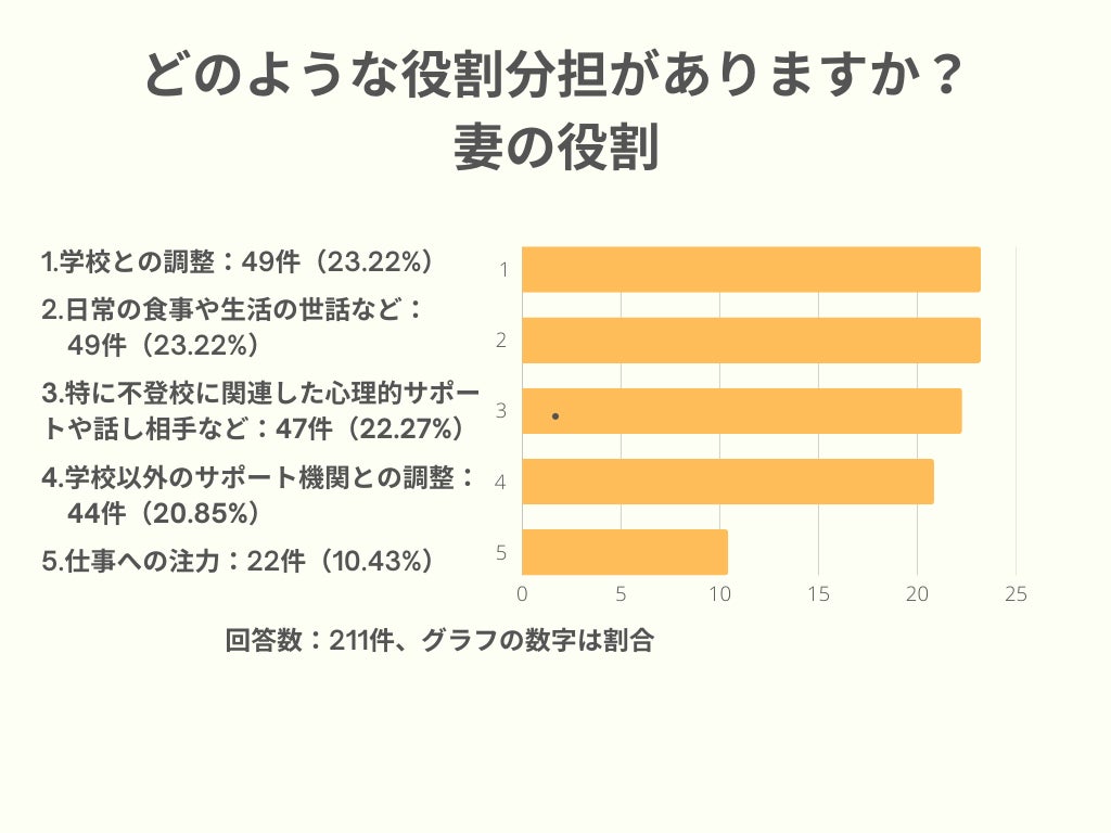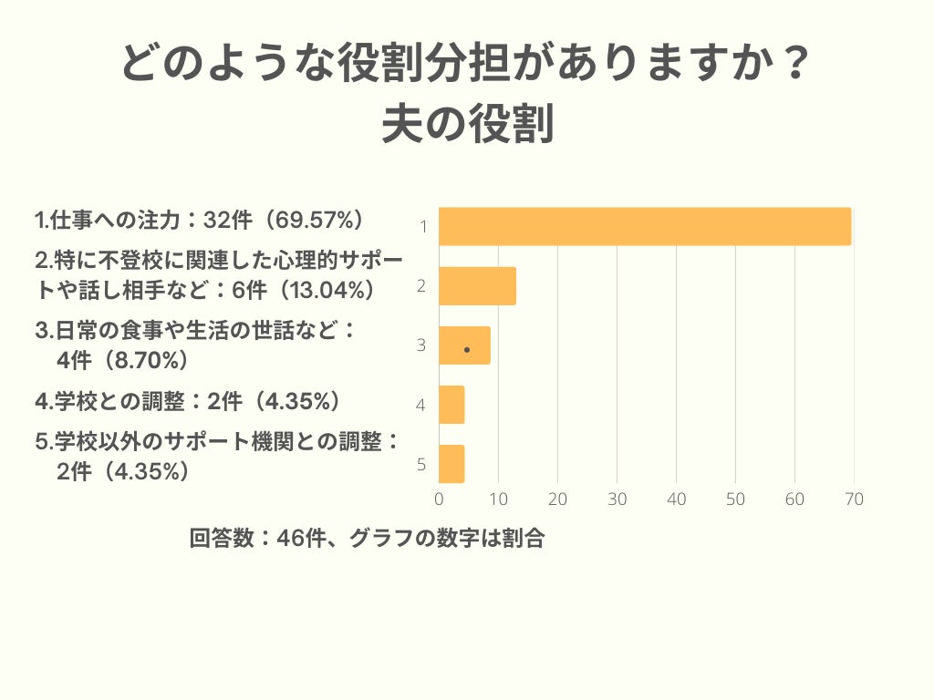 「仕事への注力」が大半を占め、子どもの不登校に直接関与する役割が少ないことが浮き彫りになっています。心理的サポートなどに関わる夫は一部にとどまっています。