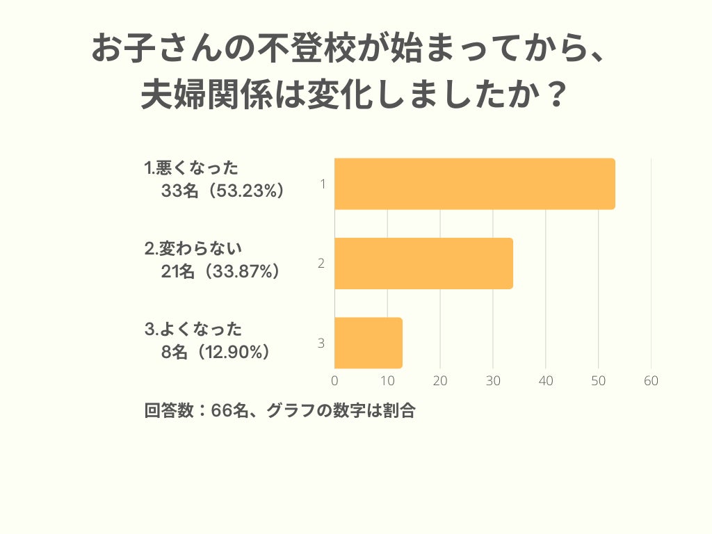 半数以上が「悪くなった」と回答しており、不登校が夫婦関係に与える影響の大きさがうかがえます。話し合いの不足や対応方針のずれが、関係の悪化につながる場合もあるようです。