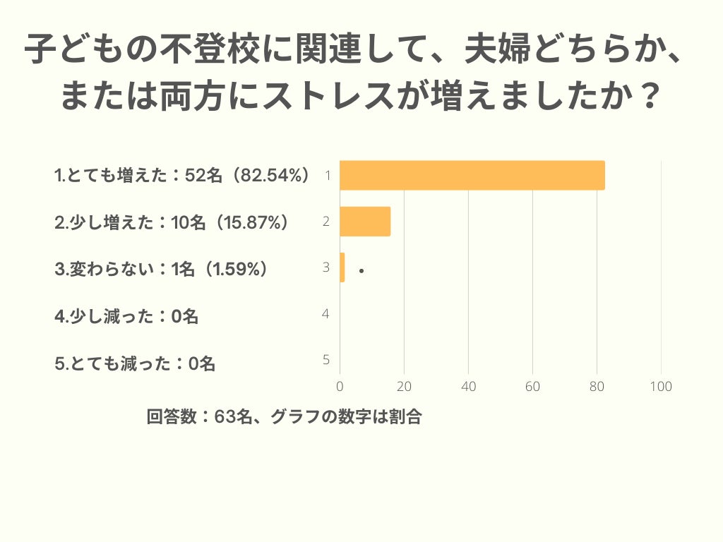 8割以上が「とても増えた」と回答しており、不登校は夫婦にとっても精神的な負荷の大きい出来事であることが明らかです。また、当然かもしれませんが、「ストレスが減った」という回答は0名でした。