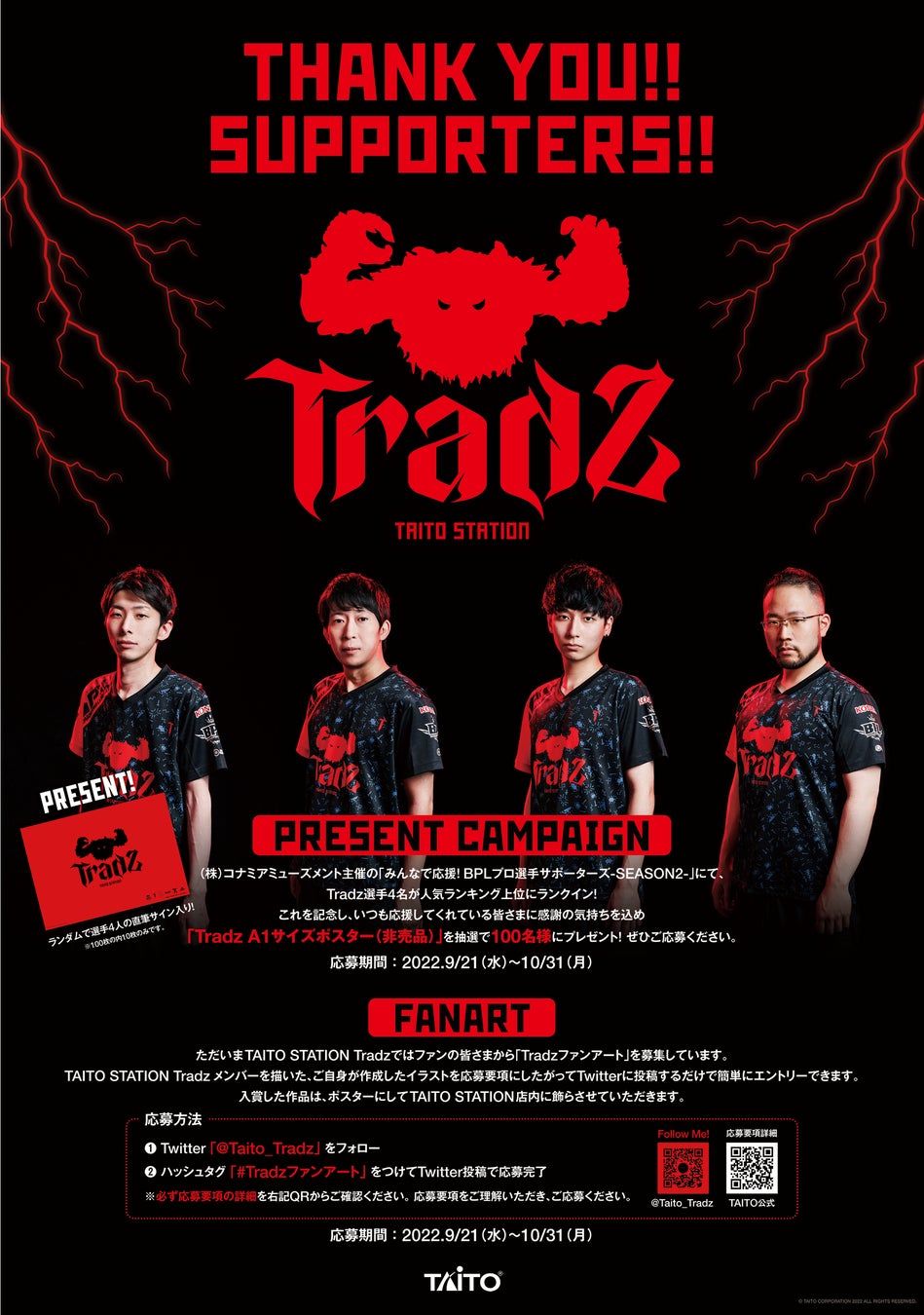 全国のタイトーステーションに掲出されているTHANK YOU SUPPORTERSのポスターにあるQRコードから応募すると、抽選で100名様に非売品の「Tradz A1ポスター」をプレゼントいたします!