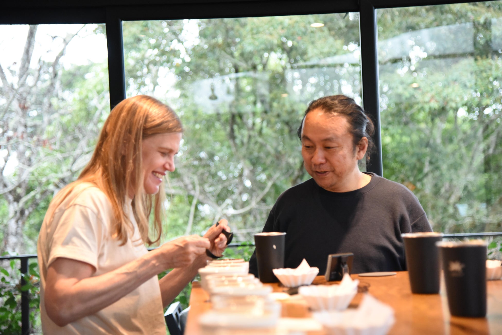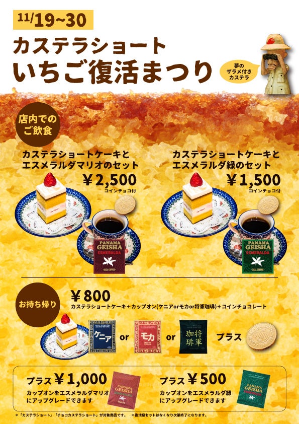 店内でカステラショートケーキと、最高峰のゲイシャコーヒー「エスメラルダ」とのマリアージュをお楽しみください。