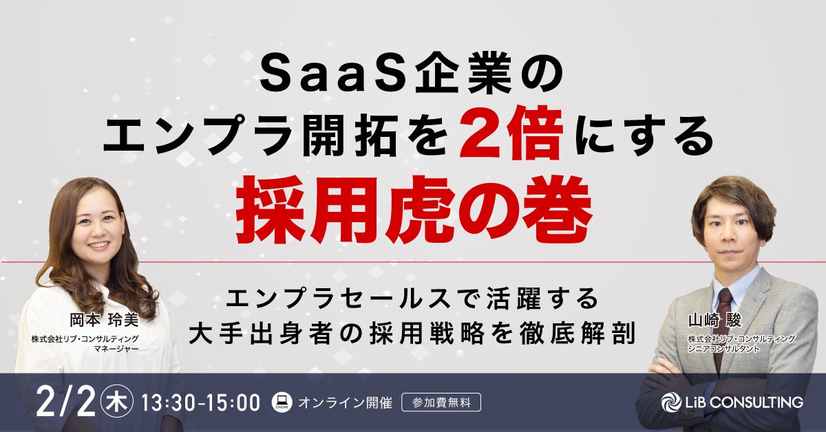 ベンチャー・スタートアップのコンサルティングを得意とする株式会社リブ・コンサルティング(本社:東京都千代田区、代表取締役:関 厳)は、社員数50~100名規模のSaaSベンチャー・成長企業が抱える「ベンチャーで活躍する大手企業出身者の見極め・採用」というテーマの基、エンプラセールス人材の獲得という点にフォーカスをおき、定義すべき人材要件、母集団形成から面接手法など具体的なTipsも含めてお伝えするセミナーセミナーを2023年2月2日(木)に開催いたします。