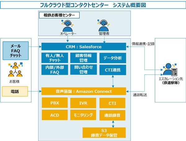 本システムはアマゾン ウェブ サービス(以下AWS)が提供するクラウド音声基盤「Amazon Connect」と、株式会社セールスフォース・ドットコム(以下Salesforce)が提供するクラウド型サービスプラットフォーム「Salesforce Service Cloud(以下Service Cloud)」を活用し、相鉄グループの問い合わせ窓口である「相鉄お客様センター」の音声基盤から応対履歴の管理、相模鉄道・相鉄バスを中心としたグループ各社との将来的な情報連携の基盤をすべてクラウド上で実現したものです。