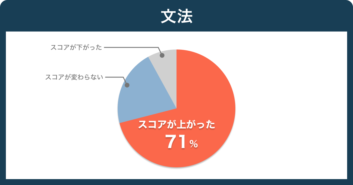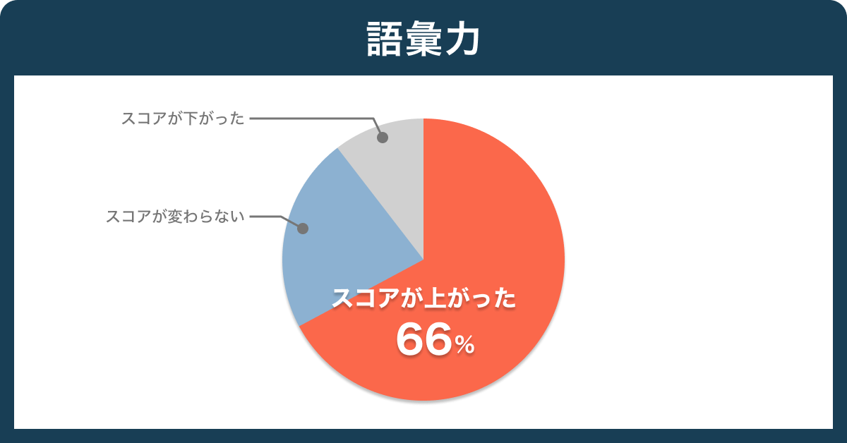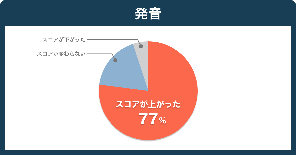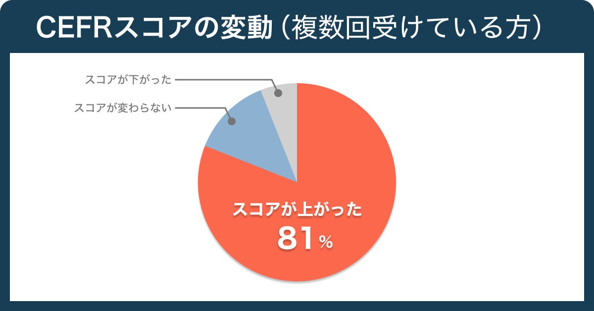 対象者のうち、2回以上テストを受けられている方の80.9%が前回よりもレベルが上がる結果となりました。当社で提供しているスピーキングテストは、質問を与えられ、それに対し指定された秒数内に答えをまとめて指定された秒数内に回答する形式となります。流暢さ・語彙力・文法・発音の4つの項目に分けて判定されますが、レッスンを通して多くの方の総合的なレベルアップが確認できる結果*となりました。