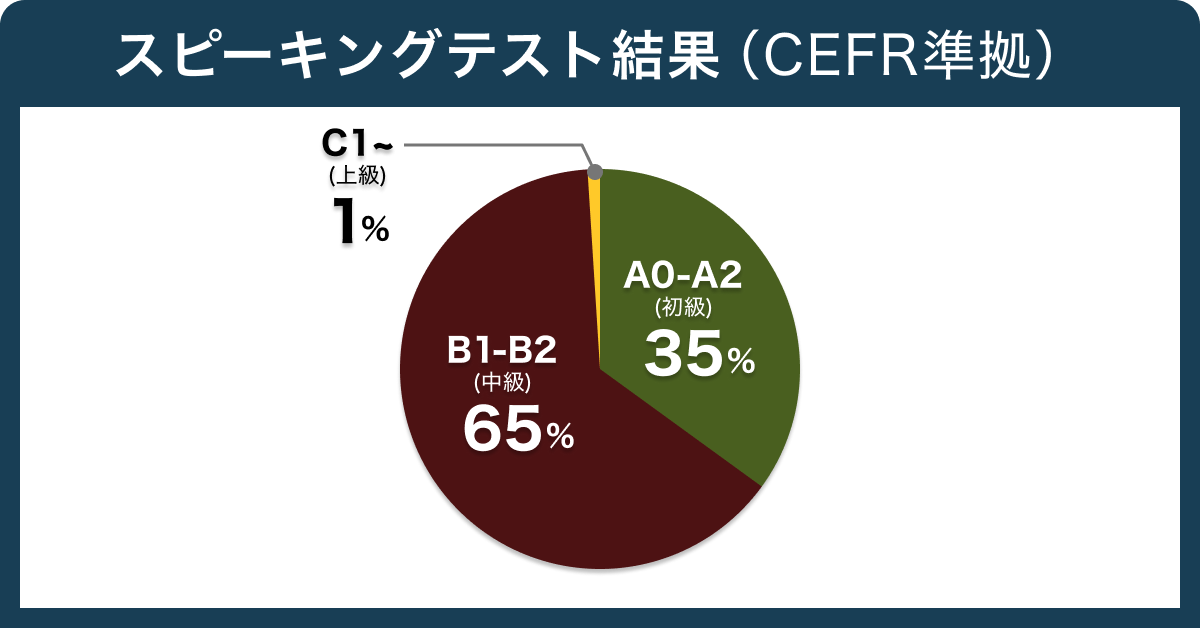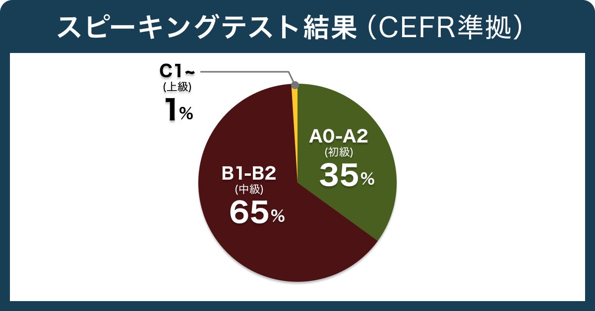 今回の初回テスト結果調査において、対象者のうち64.2%がB1からB2に該当する中級者レベルの判定となりました。また、34.8%がA0からA2に該当する初級者レベルの判定となりました。