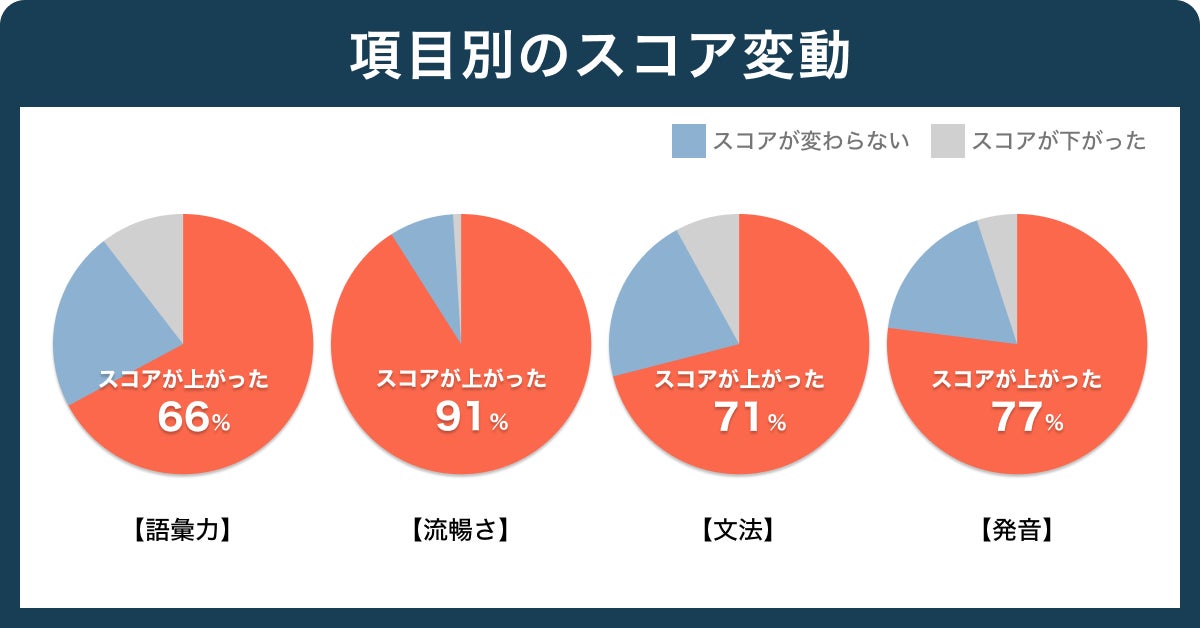 項目別の結果としては、「流暢さ」においては91.2%の方がレベルアップしておりました。また、「文法」と「発音」に関してはそれぞれ70%以上の方がレベルアップする結果となりました。