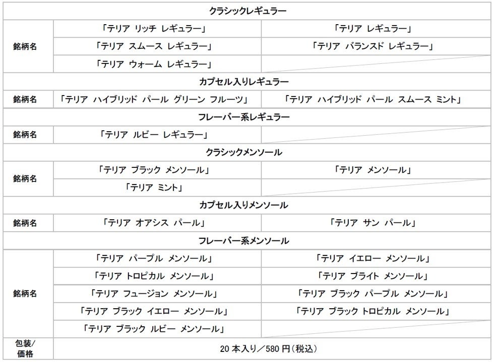 今回の「テリア ブラック サンシャイン メンソール」の発売に伴い、テリア製品のラインアップは全23銘柄となります。