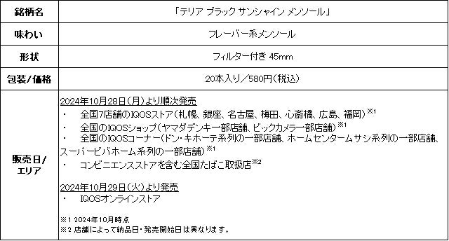 フィリップ モリス ジャパン合同会社(本社:東京都千代田区、社長:シェリー・ゴー、以下「PMJ」)は、加熱式たばこIQOS ILUMA i(イルマ アイ)およびIQOS ILUMA(イルマ)シリーズ専用たばこスティック「TEREA(テリア)」から、「テリア ブラック サンシャイン メンソール」を、2024年10月28日(月)より、全国7店舗のIQOSストア※、IQOSショップ(ヤマダデンキ一部店舗、ビックカメラ一部店舗)、IQOSコーナー(ドン・キホーテ系列の一部店舗他)、コンビニエンスストアを含む全国のたばこ取扱店で、2024年10月29日(火)より、IQOSオンラインストアにて順次発売いたします。