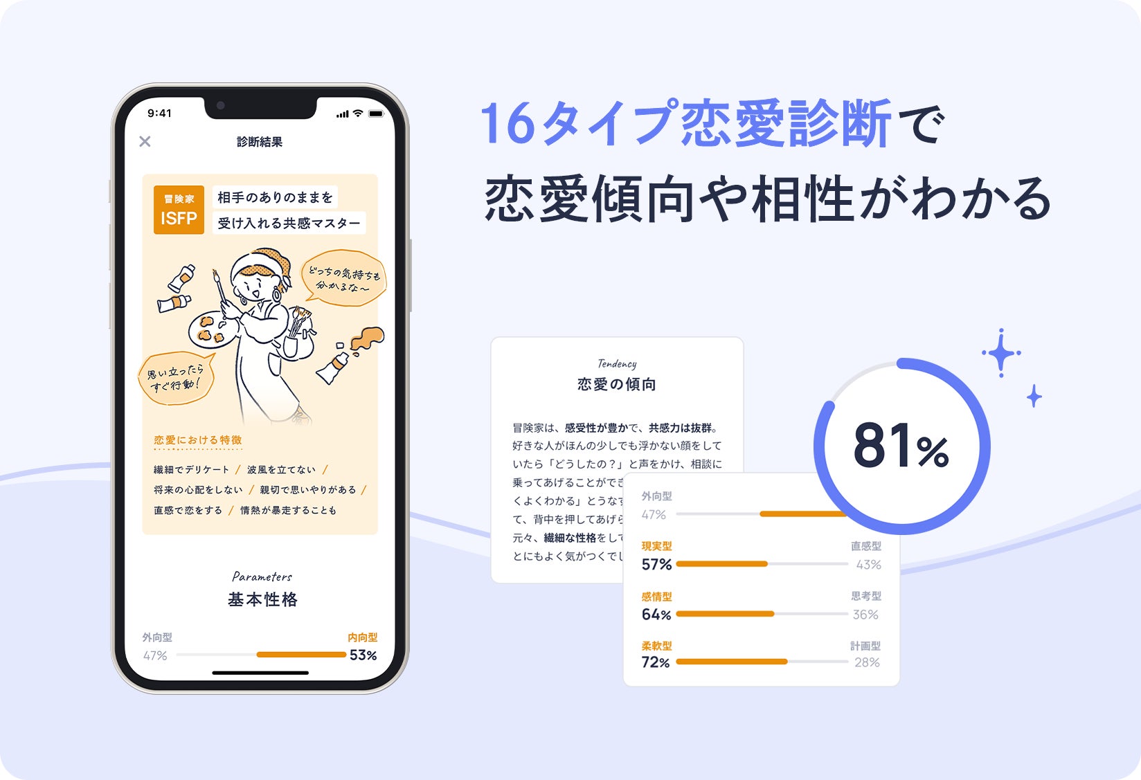 16タイプ恋愛診断は、心理学者の富田隆(※2)氏が監修した恋愛診断で、自分の恋愛観を知ることができます。さらに、診断結果を基にした相性分析で、あなたにぴったりのお相手をご紹介します。