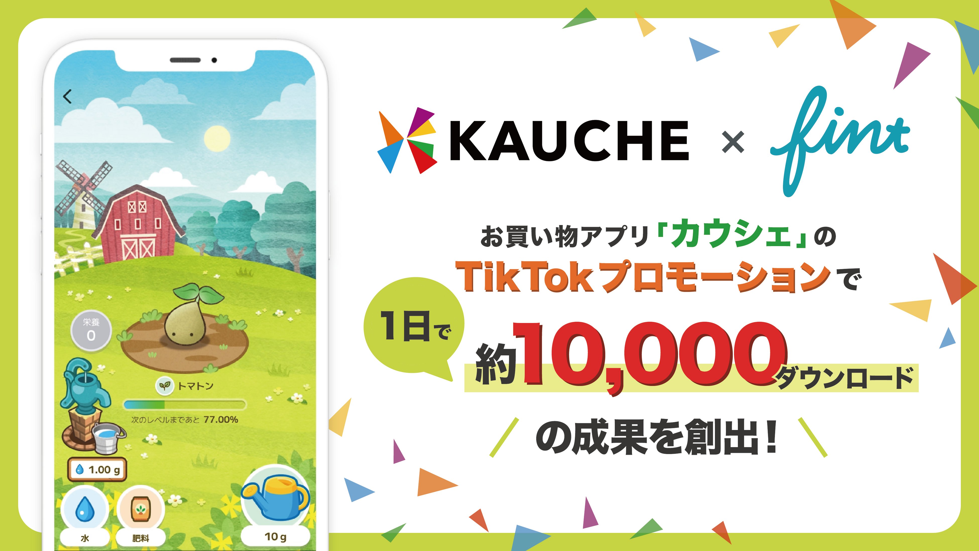 株式会社FinT(本社:東京都渋谷区、代表取締役:大槻 祐依、https://fint.co.jp/)は、株式会社カウシェ(本社:東京都渋谷区、代表取締役:門奈剣平)の提供するお買い物アプリ「カウシェ」のダウンロード数を増やすことを目的に、TikTokプロモーション施策を実施しました。本施策では、TikTokのプラットフォーム上の特性を生かしながら、ターゲットに合わせたコンテンツ制作を行うことで、1日で約10,000ダウンロードの成果を創出しました。