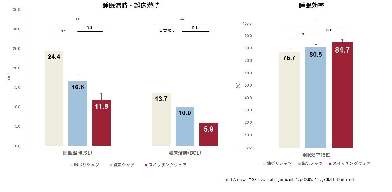 素材のシャツと比べて、睡眠潜時、離床潜時、睡眠効率といった睡眠指標の改善に寄与している傾向が見受けら