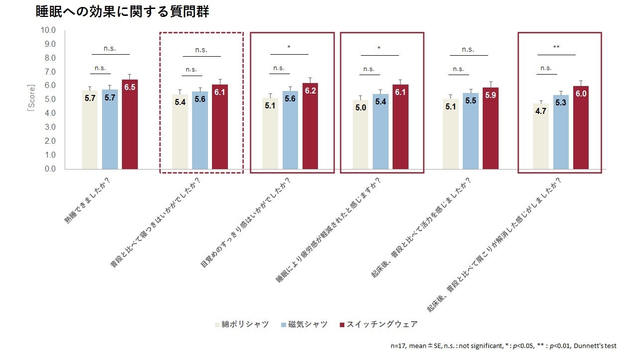 起床時に行った被験者への質問からは、「目覚め」「疲労感の軽減」「肩こりの解消」に関して、スイッチングウェアでは綿ポリシャツに対して、統計上の有意差が確認されました。客観的評価で確認された「離床潜時」の改善効果が、主観的評価でも同様に確認されています。ただし、「睡眠潜時」の改善と関連する「寝つきに関する」質問では、統計上の有意差は確認されていません。