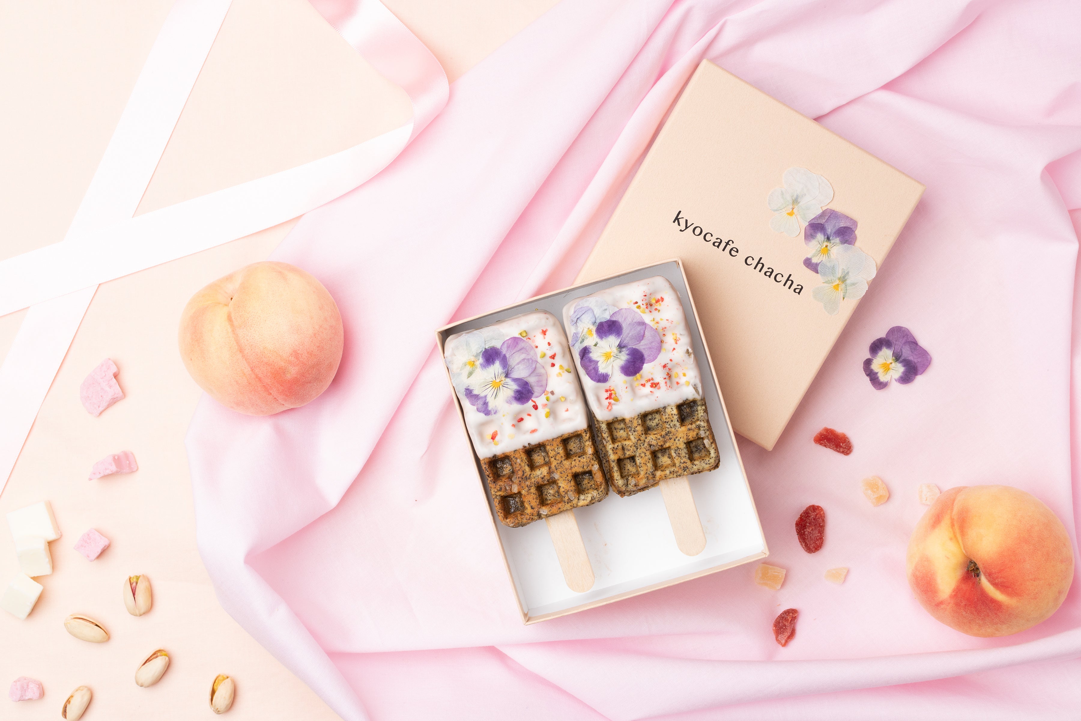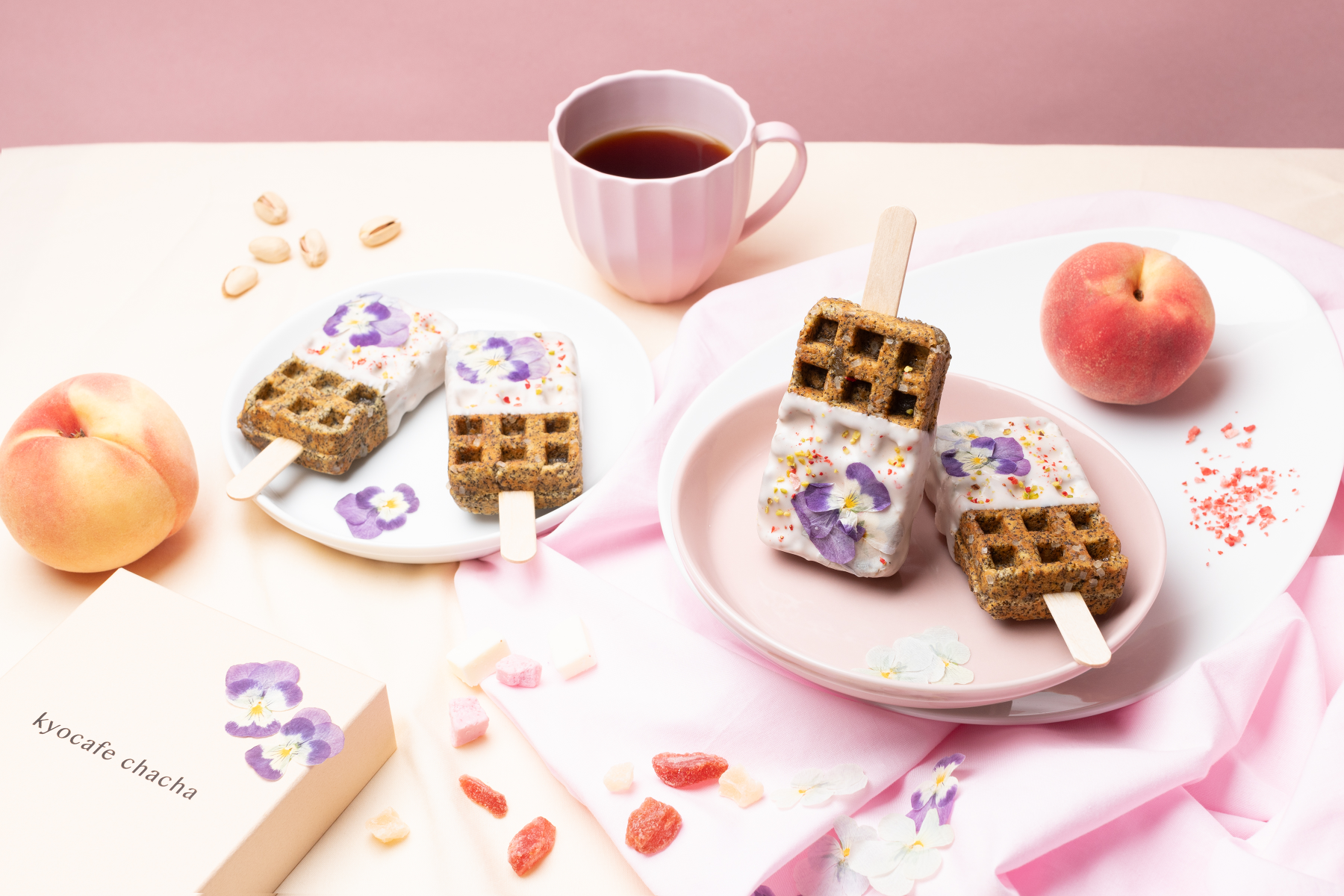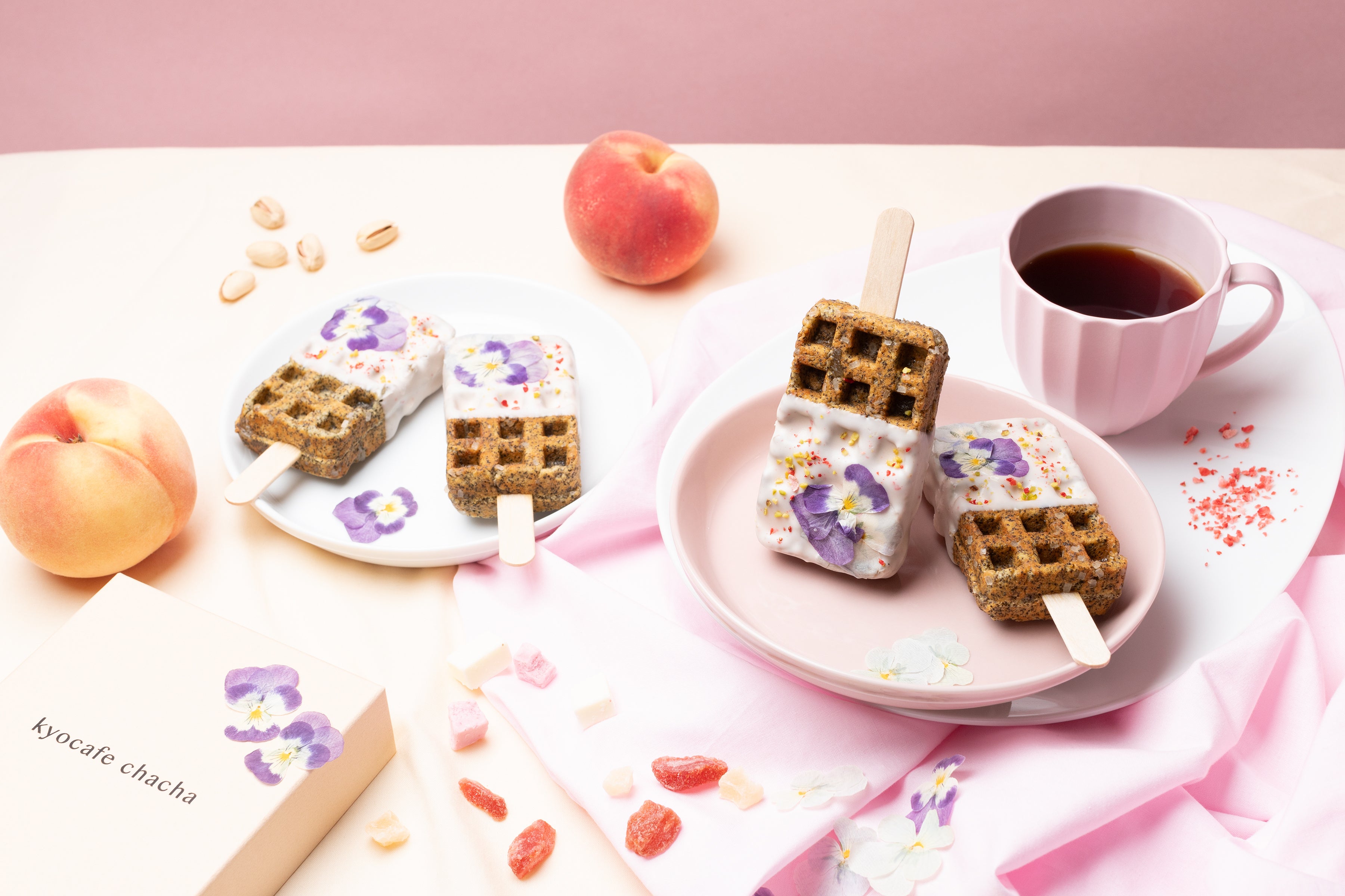 可愛くって食べやすいワンハンドスイーツとして、京都で話題の京ワッフルを展開するkyocafe chachaから、夏限定の〈まるで、食べるピーチティー?!〉な、桃×アールグレイの”フラワーピーチティー”が登場。