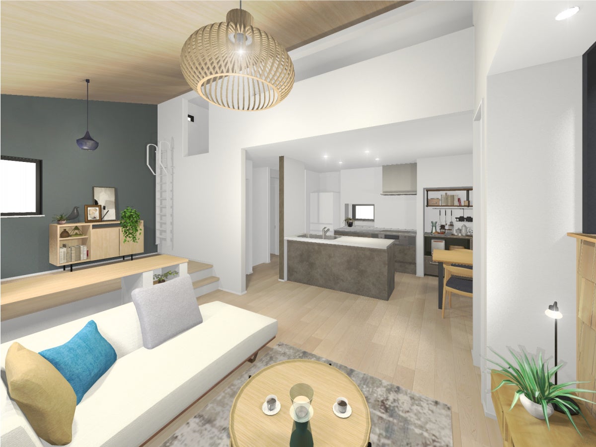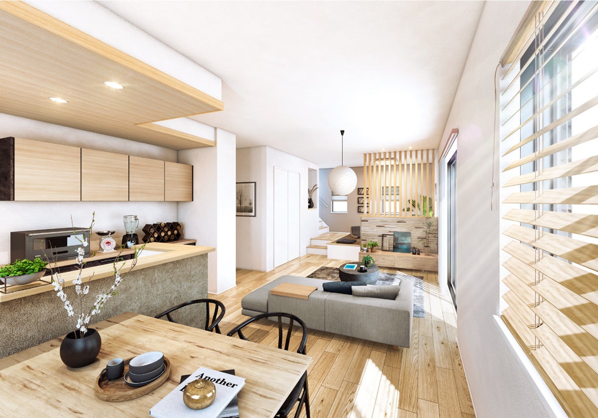 リビングの天井高を2.7M、サッシの内法高さを2.2Mに設定。陽光を採り込み、開放感のある空間を創出します。また、便利なホームフリーザーをはじめ、玄関ドアのシステムキーやスマホで簡単に給湯器の操作ができる快適なアイテムを採用しました。暮らしやすさを追求した快適な住まいを創出します。