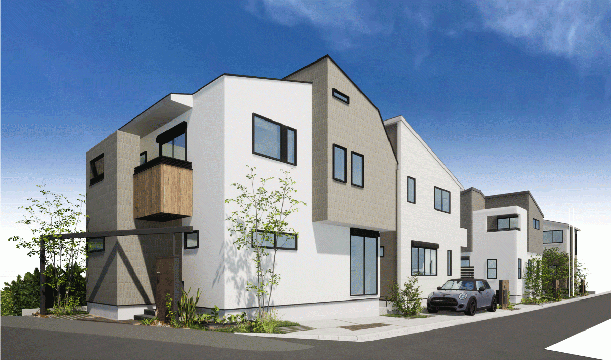 当分譲地は、前面道路に沿って4邸が一列に整然と並ぶ配当計画を施しました。アプローチ部分にゲートフレームを設置した1号棟や、土地面積120m2以上の3・4号棟には南庭を設けるなど、景観の変化や開放感を創出した全4邸の住まいです。