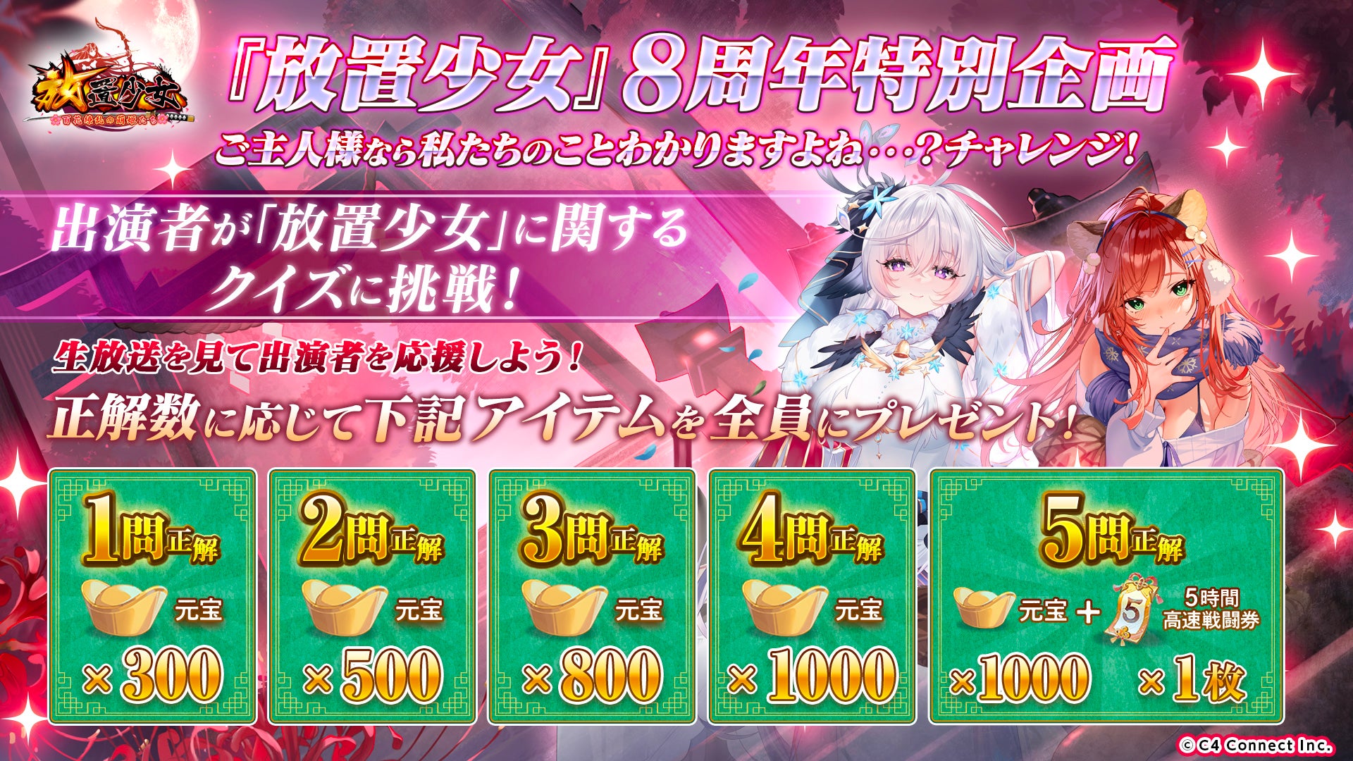 C4 Connect株式会社(本社:東京都渋谷区)は、現在サービス中のスマートフォンアプリ、美少女RPGゲーム『放置少女〜百花繚乱の萌姫たち~』(以下、『放置少女』)が3月16日(日)20時より「出逢いも再会も、感謝いっぱいな8周年!新情報&プレゼント満載な生放送SP」と題した生放送を配信することをお知らせいたします。
