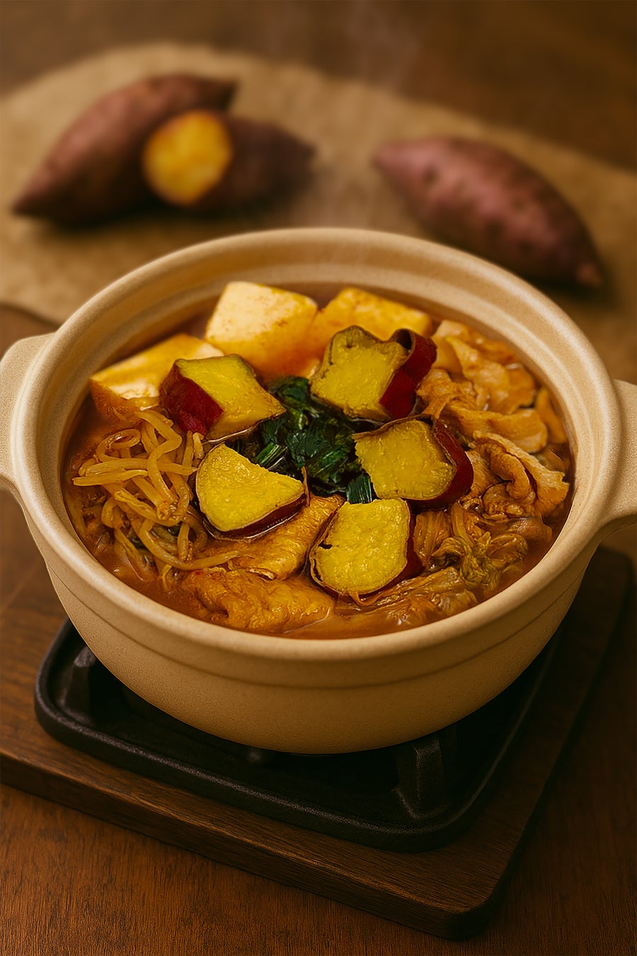 焼き芋がスープに溶け込んだ甘さと辛さの絶妙なハーモニー!お酒にもあう新感覚の旨辛鍋です