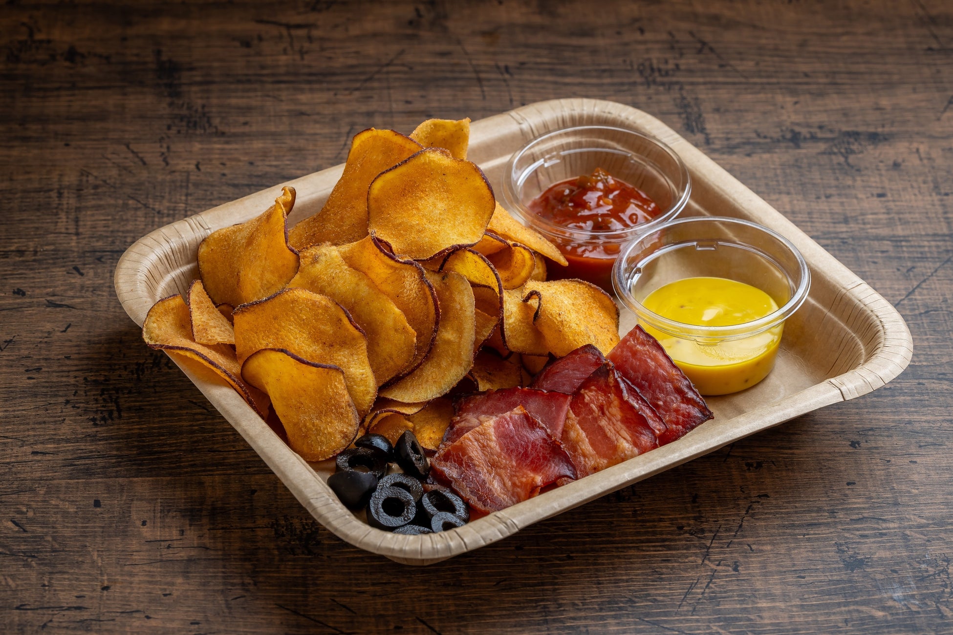 リッチコンソメ味の紅はるかチップスにハニーマスタードソースとチリソースをセット。アルコールのおつまみに最高です。