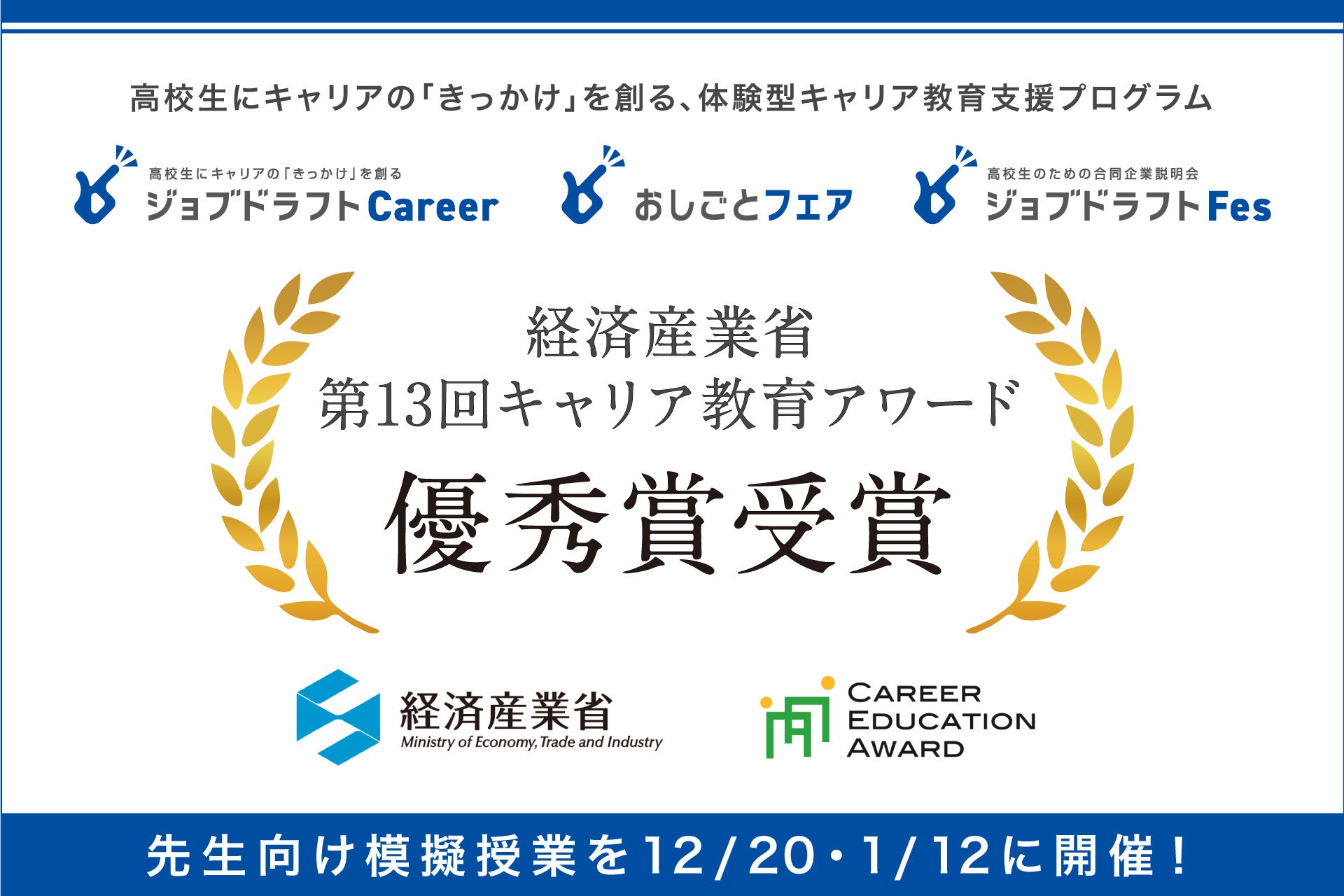 第13回キャリア教育アワード優秀賞の受賞を記念し、2023年12月20日と2024年1月12日・1月26日に「ジョブドラフトCareer」の”模擬授業”を開催いたします。