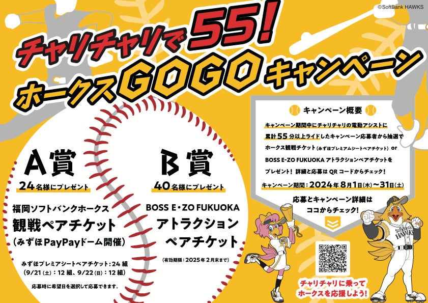 福岡をはじめ全国のファンの皆さまと、4年ぶりの日本一奪還を目指す福岡ソフトバンクホークスを応援するため、本日より「チャリチャリで55!ホークスGoGoキャンペーン」を実施します。