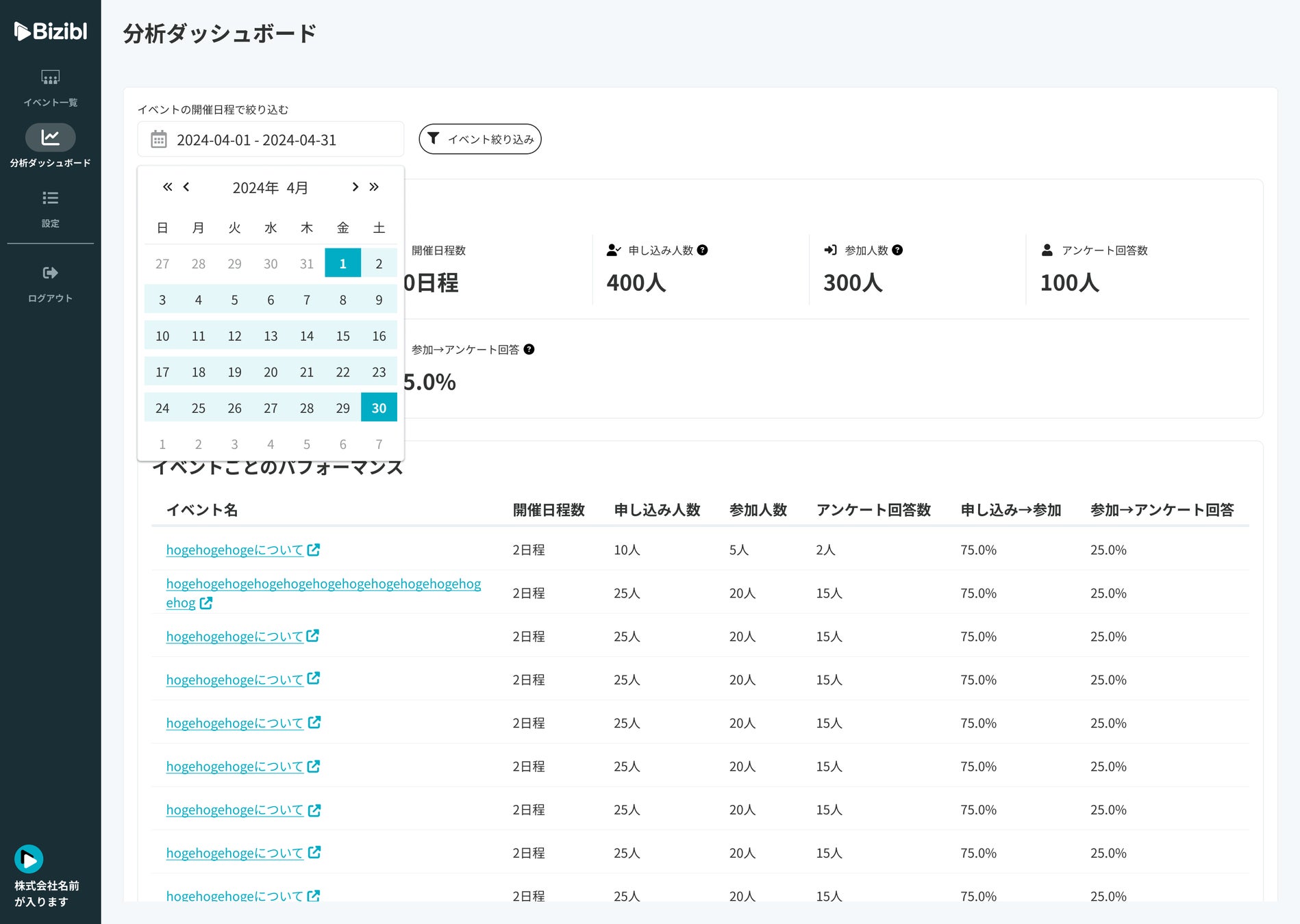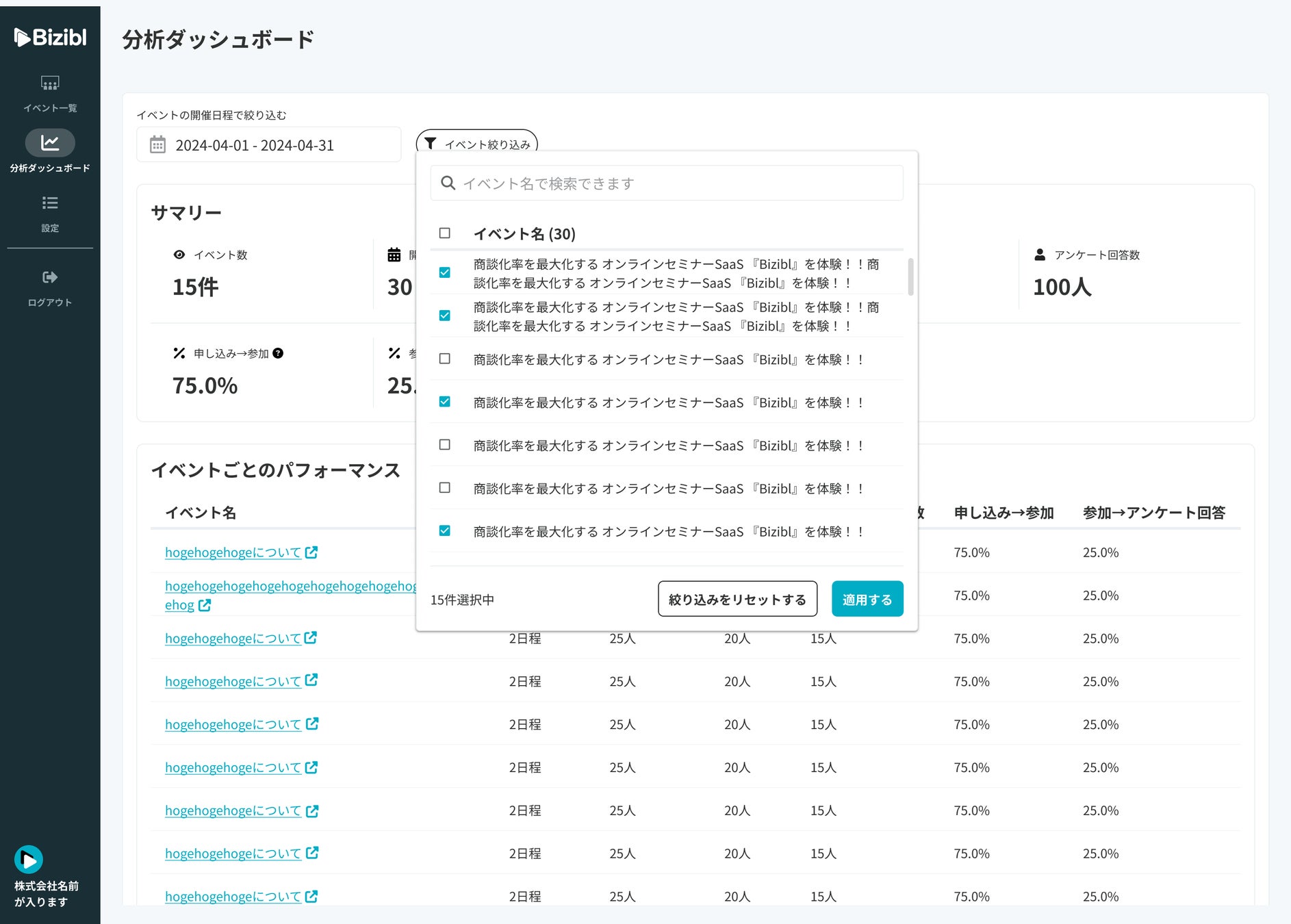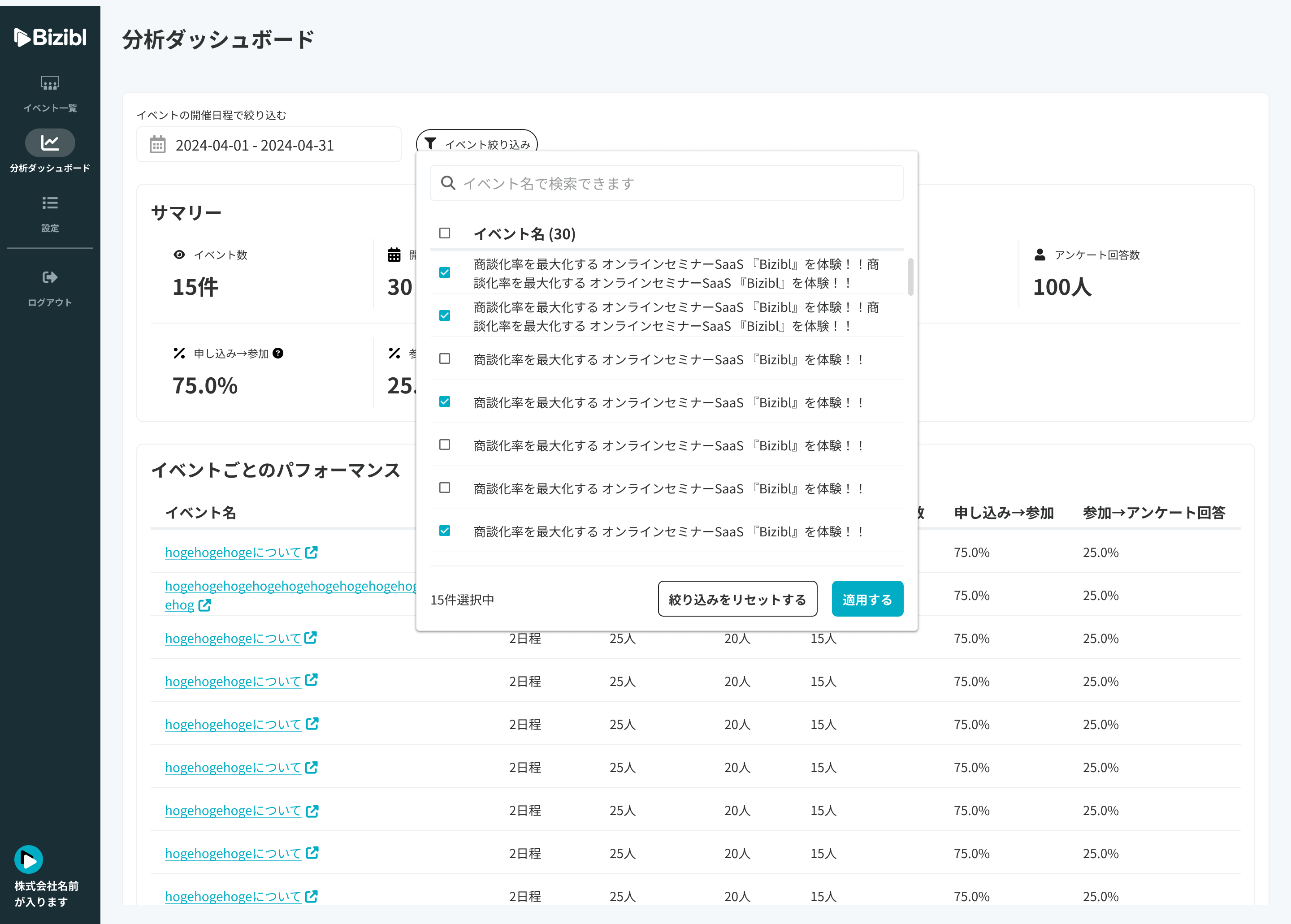 これにより、「Bizibl」上で開催したウェビナーの結果、例えばウェビナーの申し込み件数やアンケート回答数、参加率などが自動で表示されるようになりました。複数のウェビナーを横断的に集計することができ、月次の進捗状況を一目で把握することも可能です。