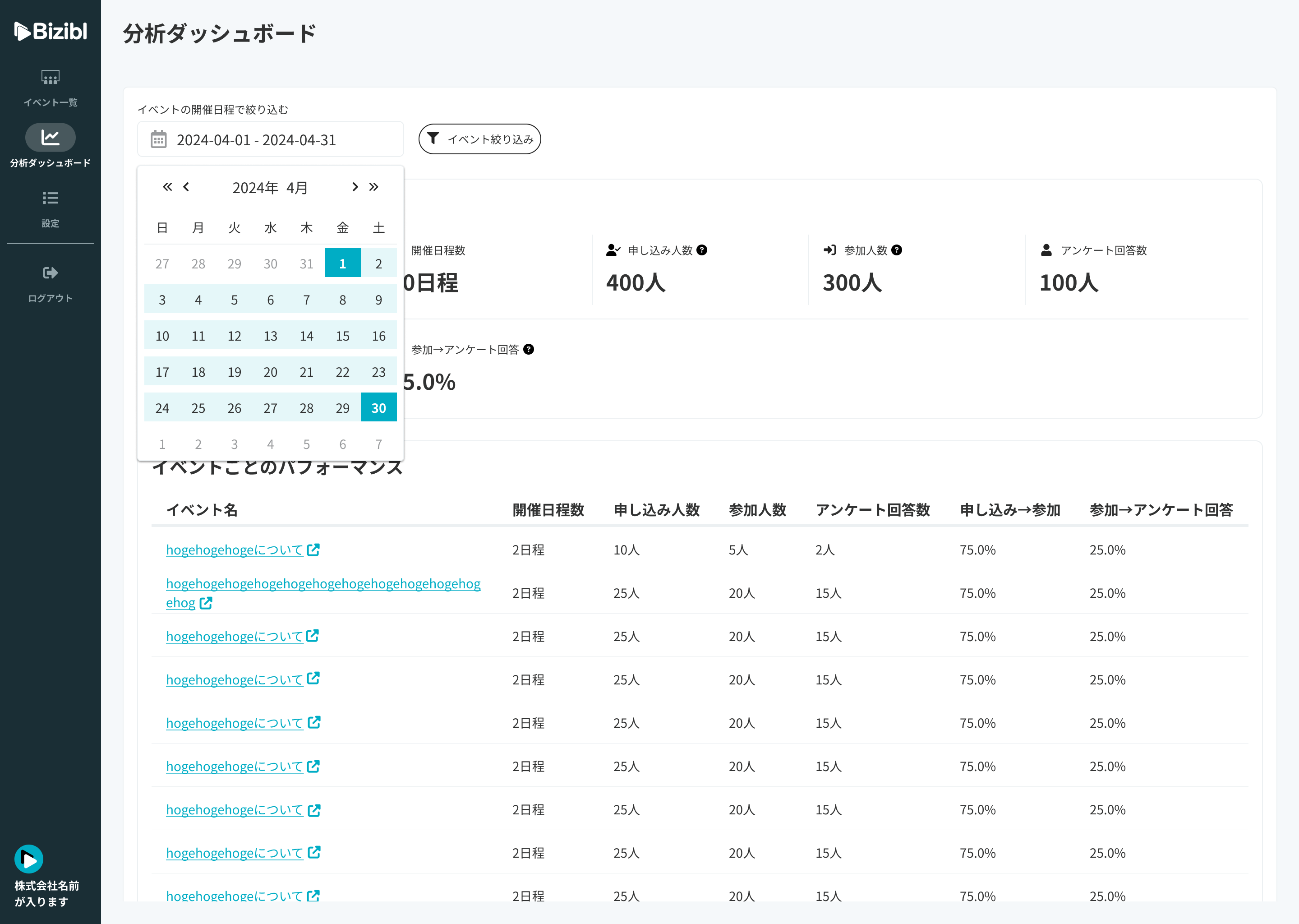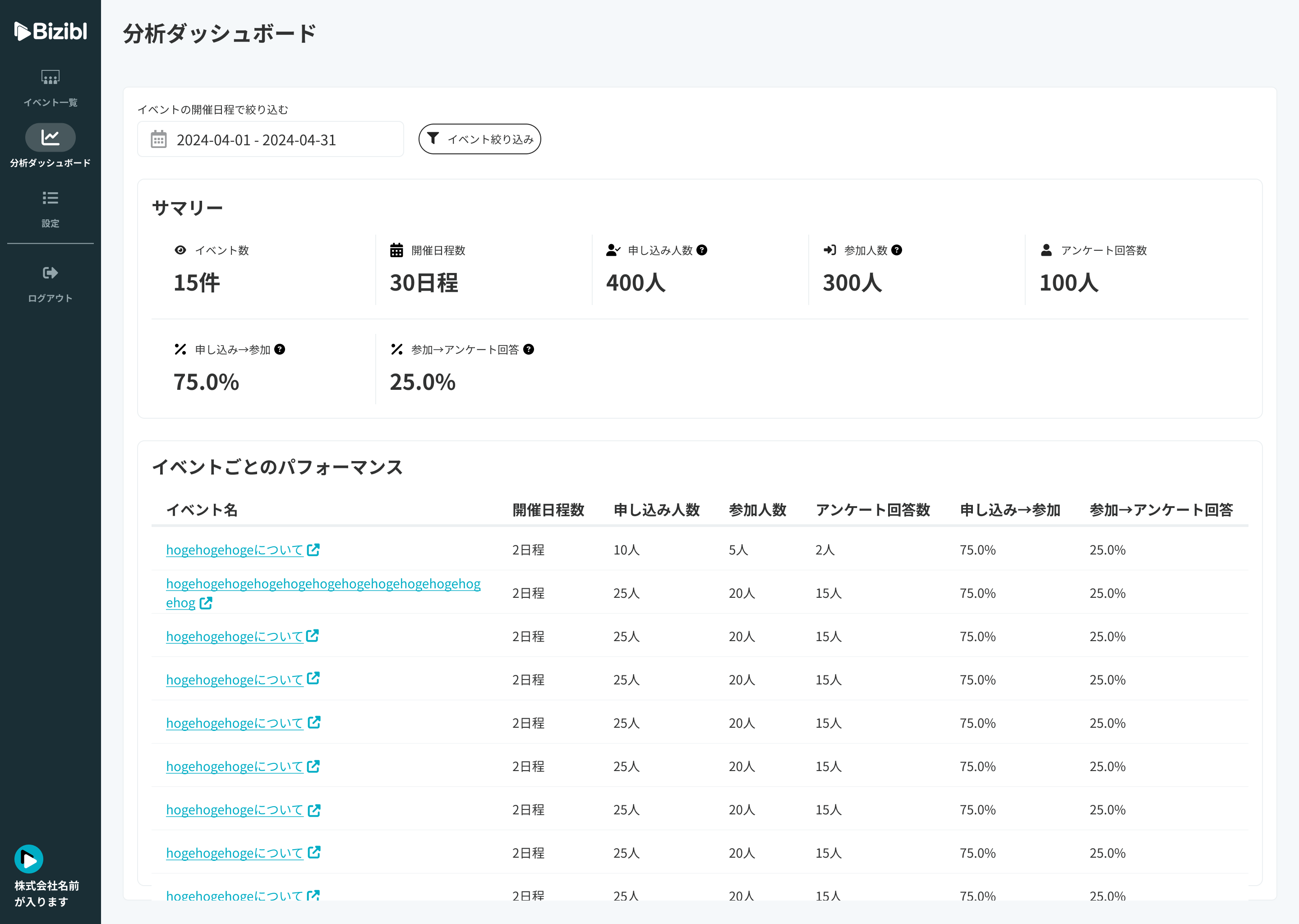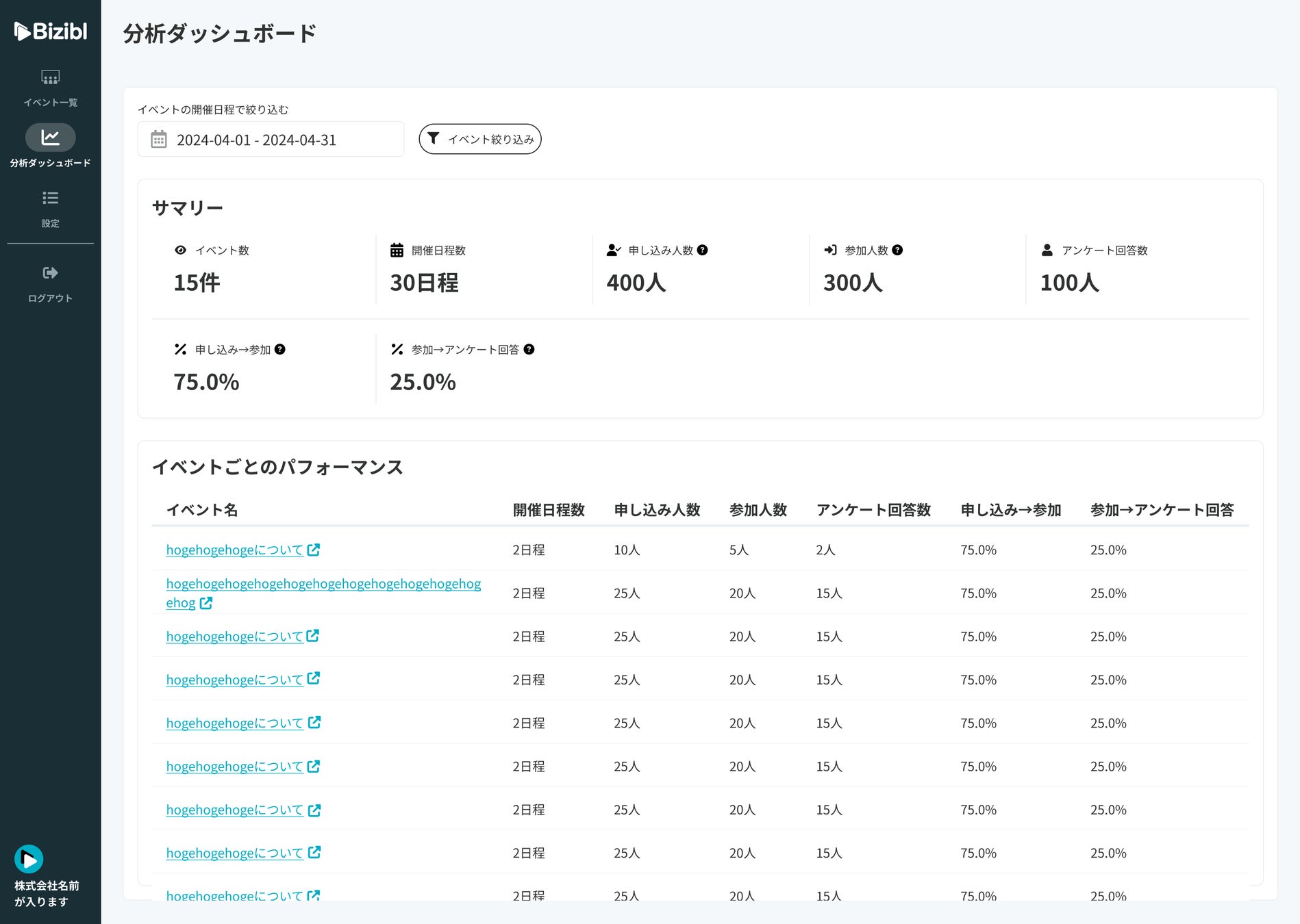 この度公開した「分析ダッシュボード機能」により、「Bizibl」上で開催したウェビナーの結果、例えばウェビナーの申し込み件数やアンケート回答数、参加率などの指標について自動で集計、算出できるようになりました。「Bizibl」上に新たに公開された「分析ダッシュボードページ」には、ウェビナーごとの集計データが一覧で表示されるほか、指定した期間における横断的なサマリー集計もでき、月次の進捗状況などを一目で把握することが可能です。
