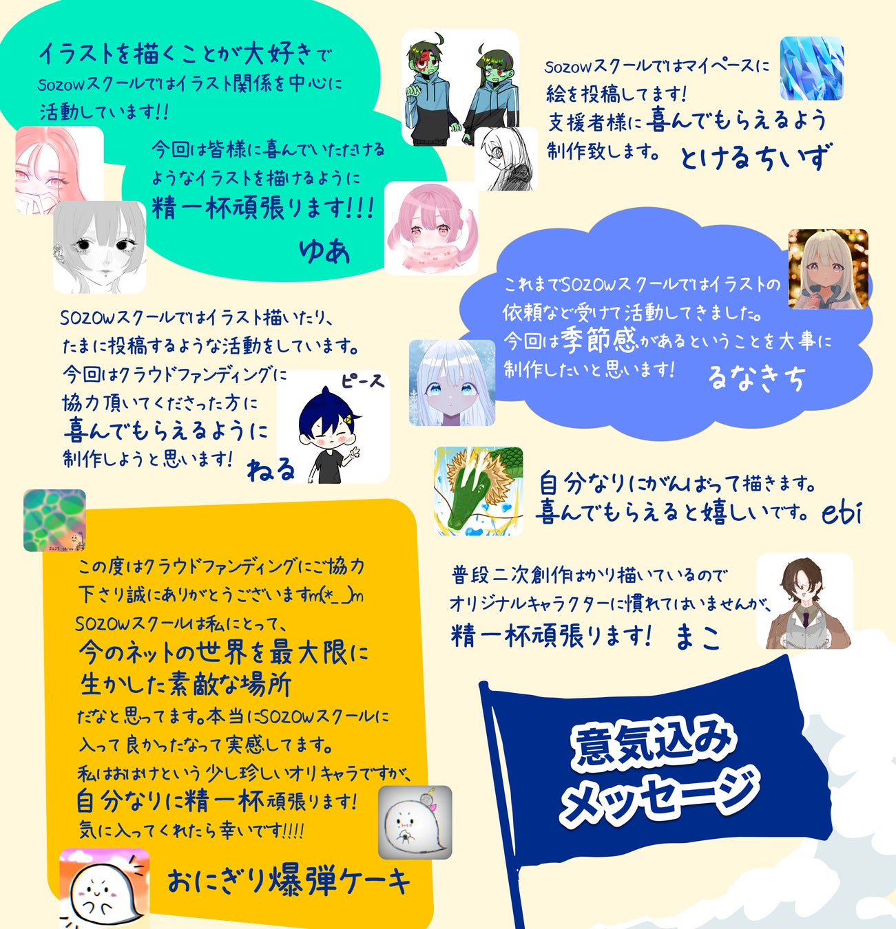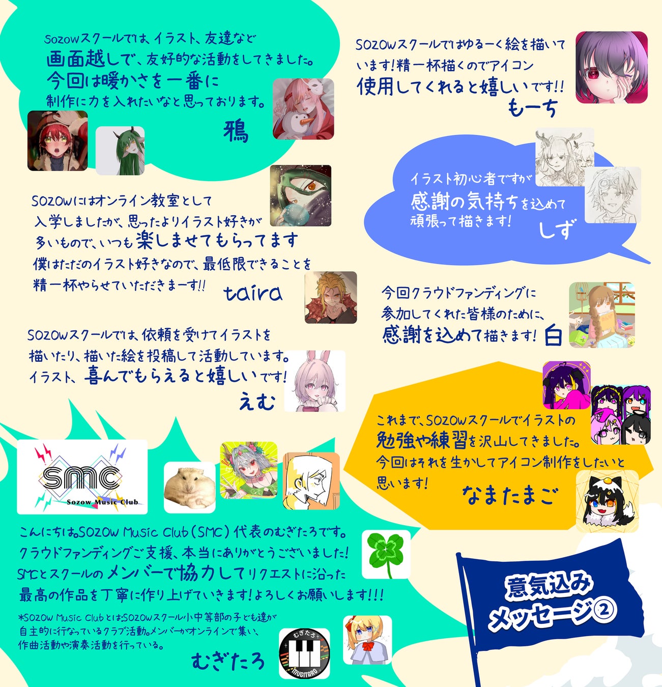最終目標の設定にあたって、日本最大級のフリースクールである「SOZOWスクール小中等部」の子どもたちによるオリジナル作品を特別限定リターンとして追加することにいたしました。(個人によるイラスト作品と共同のミュージックビデオ作品)