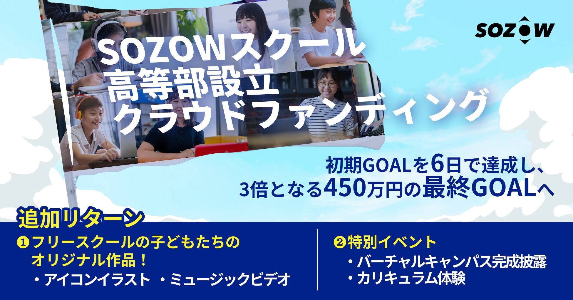 300%達成へ向けて「SOZOWスクール高等部」創設クラファン、フリースクールでの小中学生の活動の成果を限定リターンとして発表